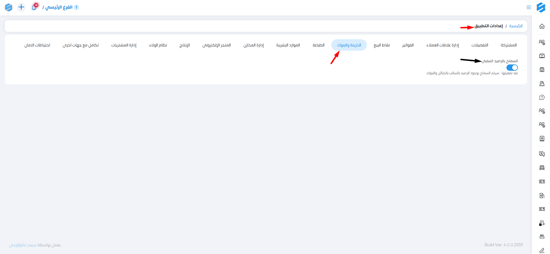 السماح بالرصيد السلبي: عند تفعيل هذا الخيار سيتم السماح بوجود الرصيد بالسالب بالخزائن والبنوك.
