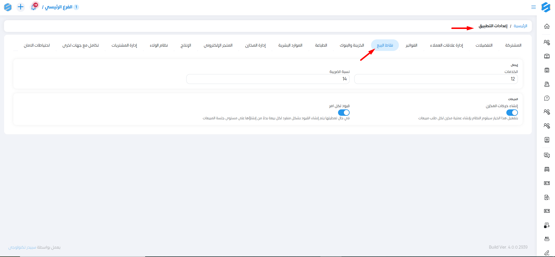 من خلال إعدادات نقاط البيع .. يمكننا التحكم في بعض الإعدادات الخاصة بنظام نقاط البيع مثل: