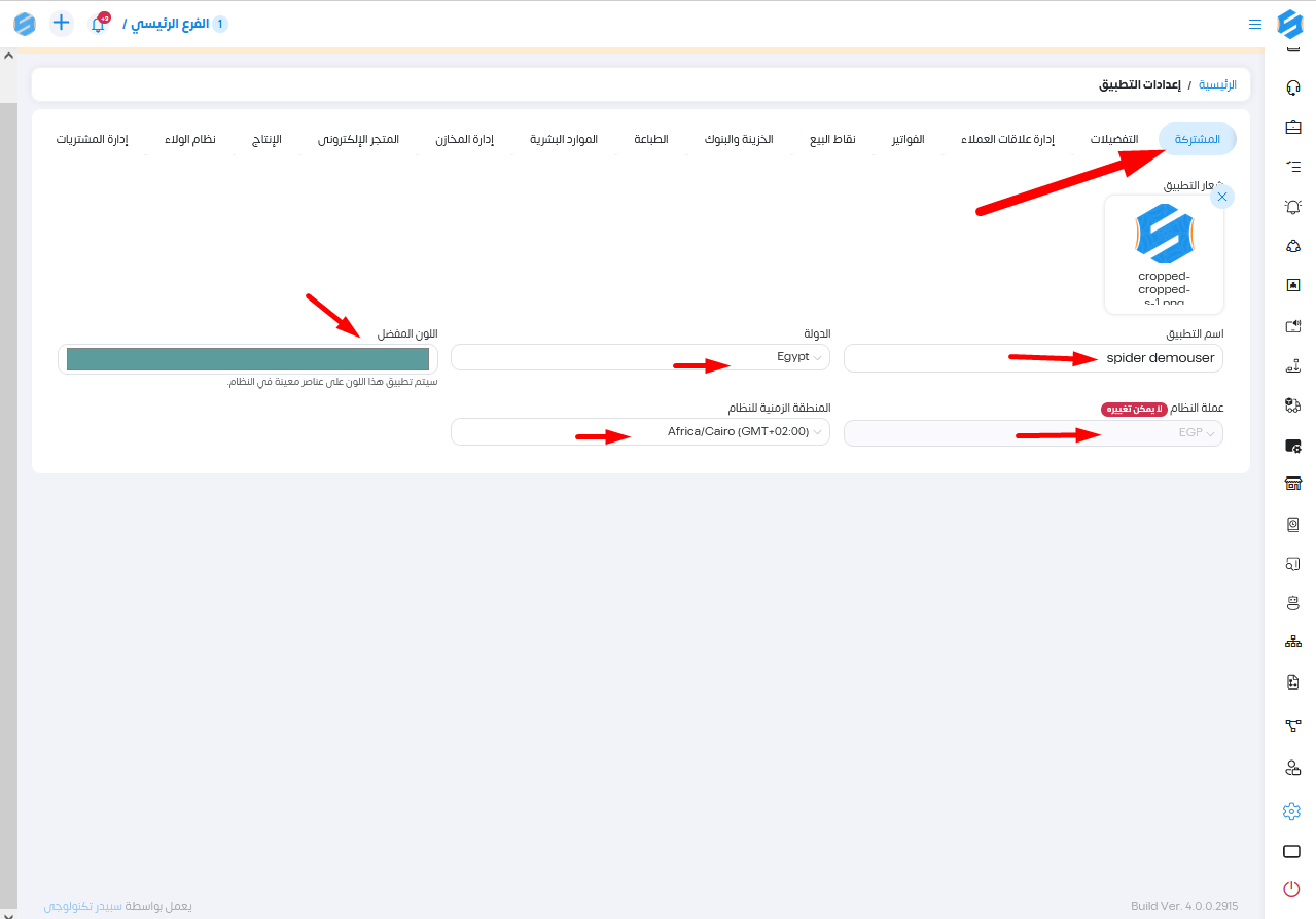 نسجل فى الإعدادات المشتركة . ... -الشعار -اسم التطبيق .. كذلك اضافة -الدولة -عملة النظام - اللون المفضل - المنطقة الزمنية للنظام