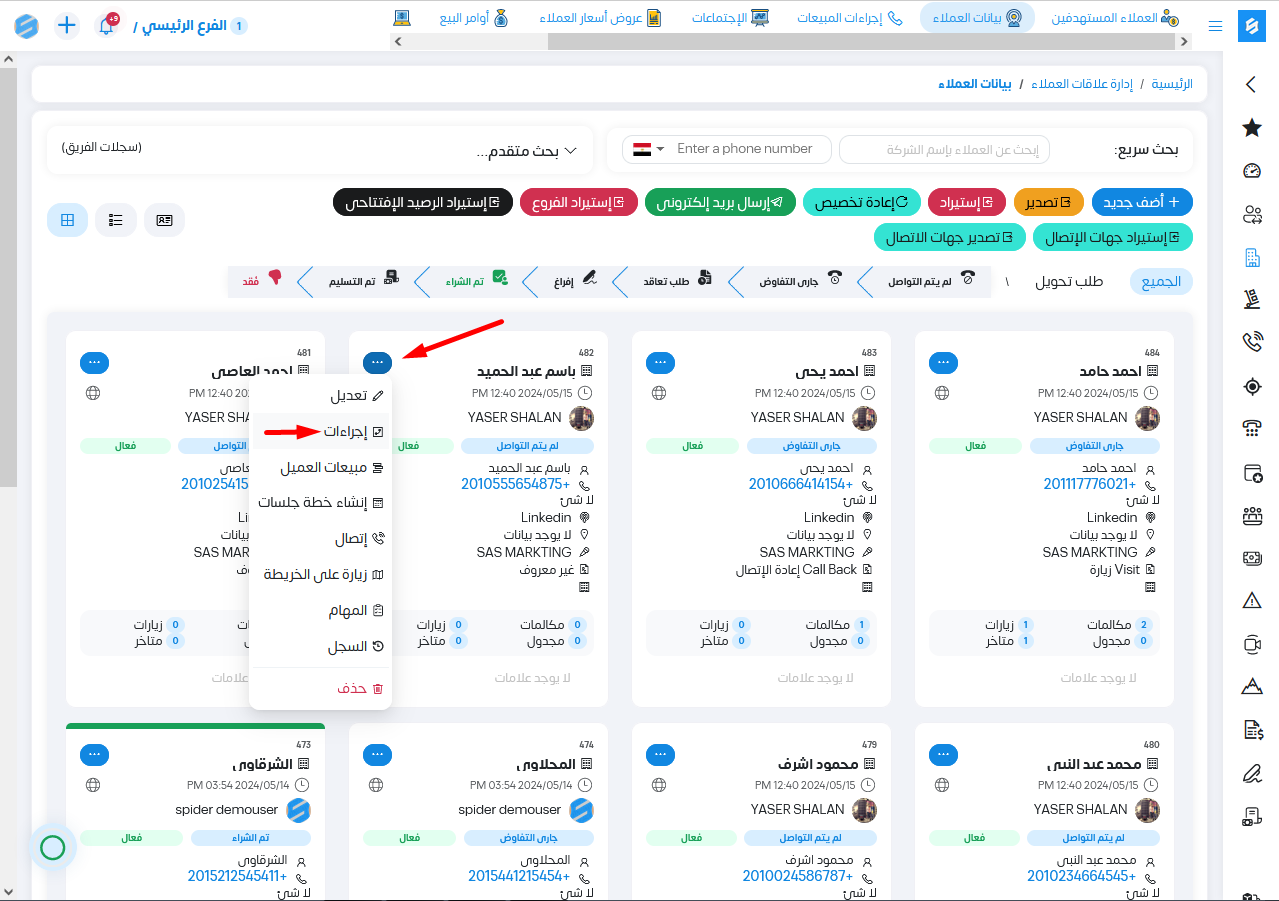 من خلال الضغط على الثلاث نقاط الخاصة ببيانات العميل . ثم الضغط على إجراءات