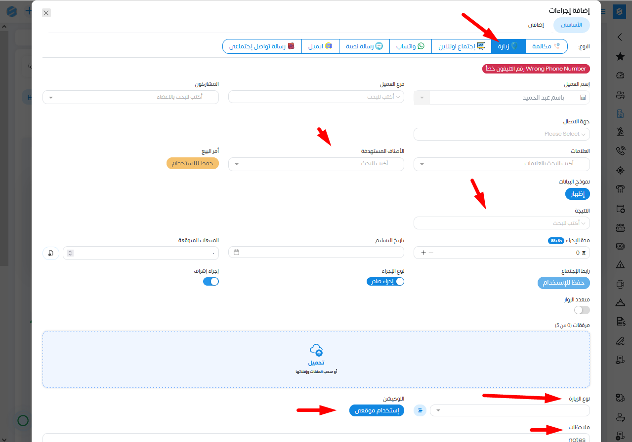 قم باختيار نوع الإجراء زيارة ونقوم بملئ البيانات كما فعلنا فى تسجيل المكالمة