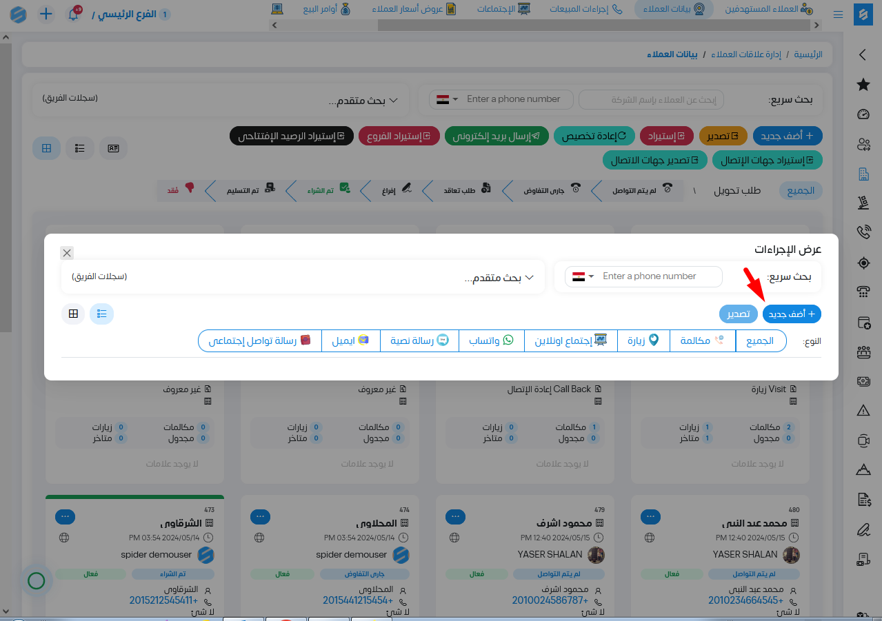 سيظهر لنا عرض الإجراءات التى تمت على العميل . وكذلك يمكننا إضافة إجراء جديد من خلال الضغط على اضف جديد