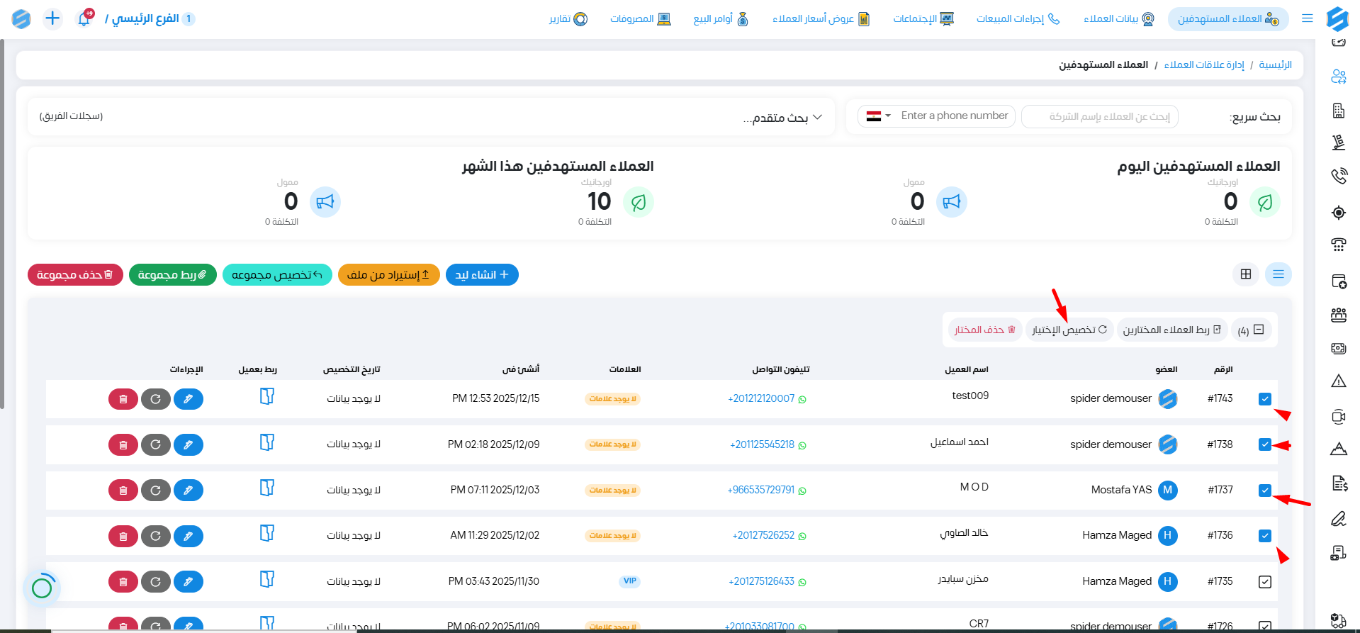 1-تخصيص يدوي: يمكننا تحديد مجموعة من العملاء المستهدفين بناء على البحث الذي قمنا به او عشوائيا عن طريق اختيار العملاء المستهدفين بالشكل التالي ثم الضغط على تخصيص الاختيار .
