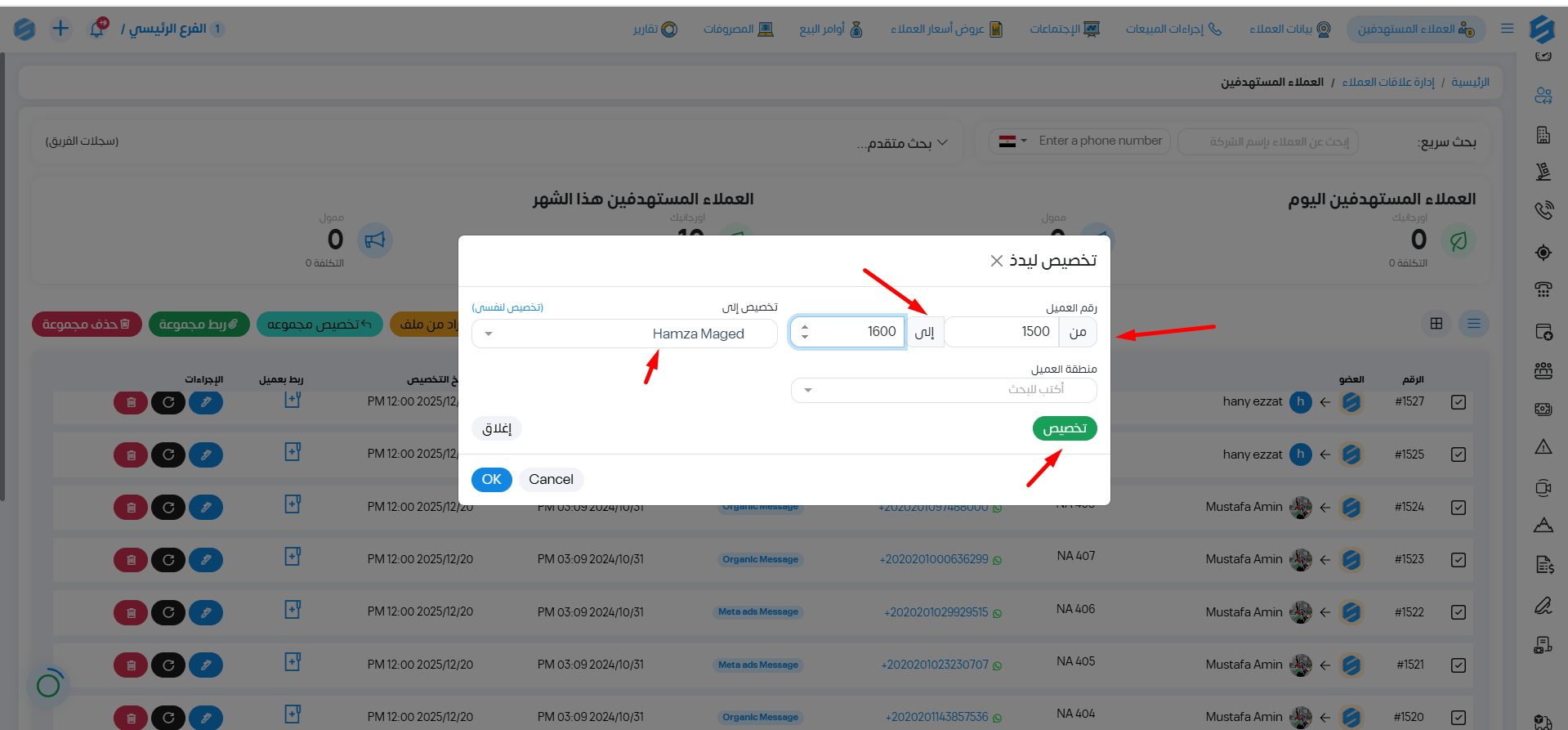 نحدد رقم العملاء المستهدفين الذين سيتم تخصصيصهم كارقام (من -->إلى) وتحديد العضو ثم تخصيص .