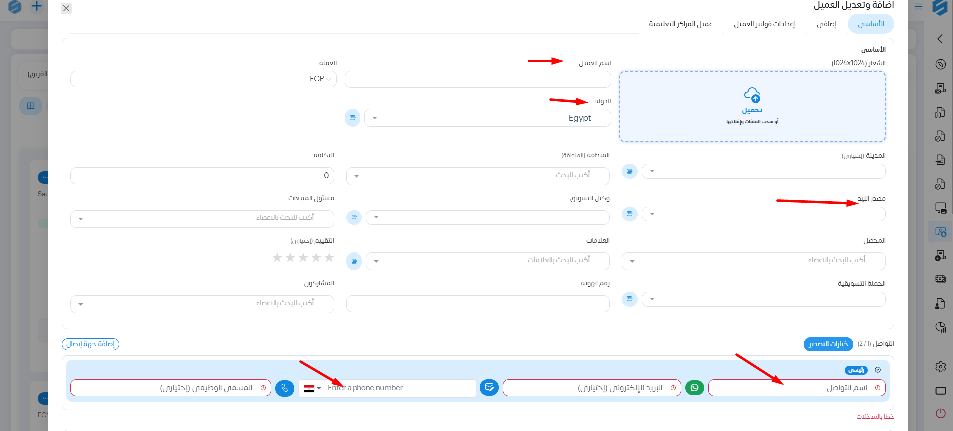 نقوم بملئ بيانات العميل . اسم العميل الدوله مصدر العميل اسم التواصل رقم التواصل ونضغط إضافة