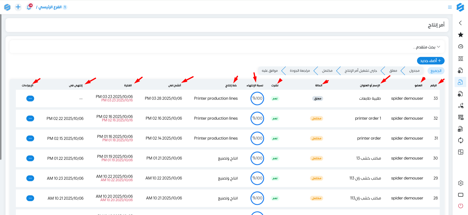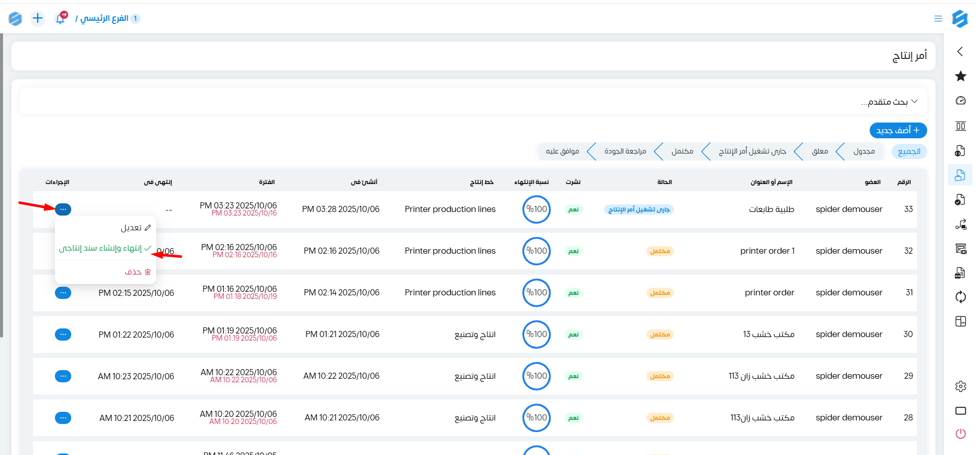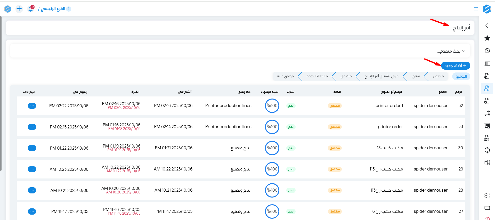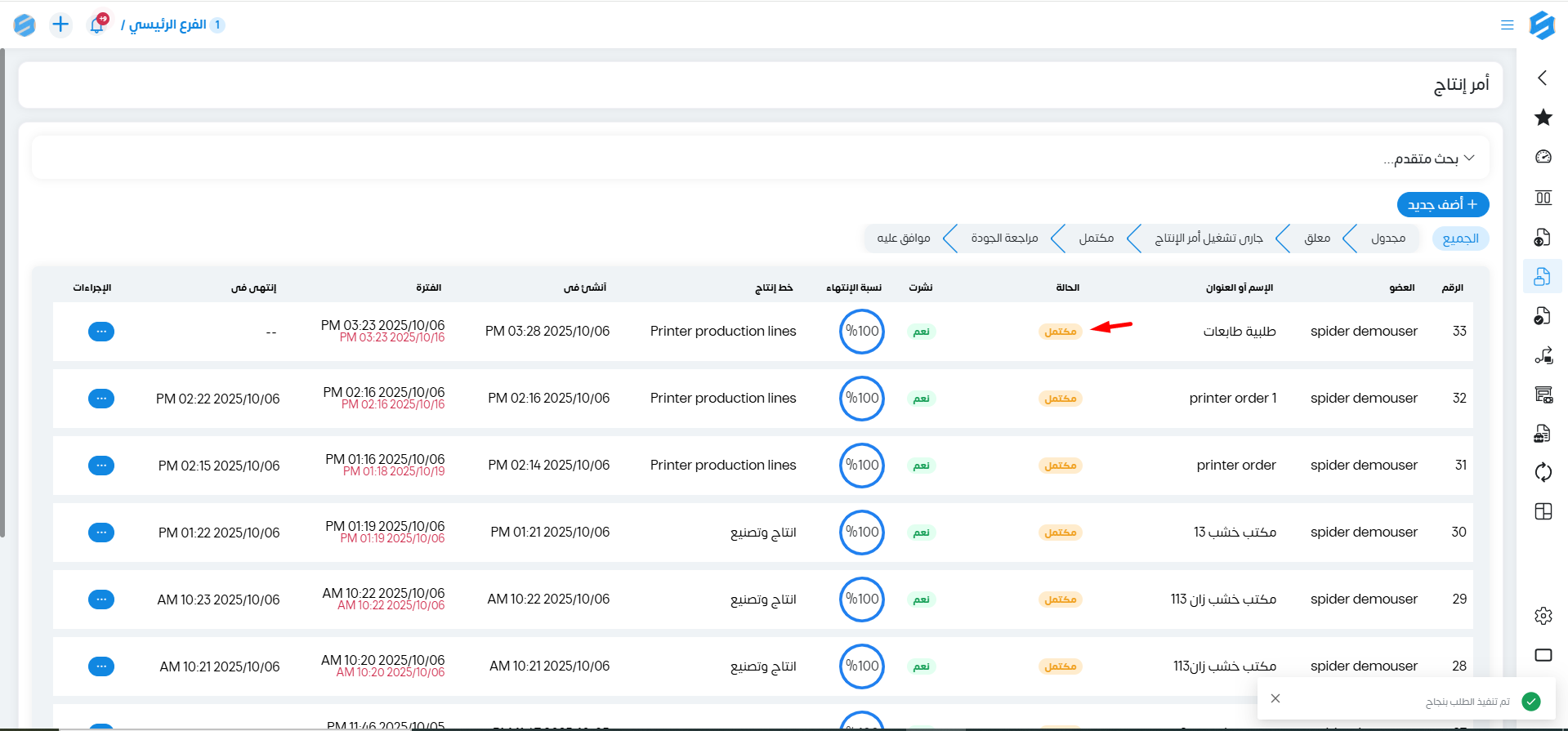 بعد اضافة أمر الانتاج هيظهر بالشكل الاتي.