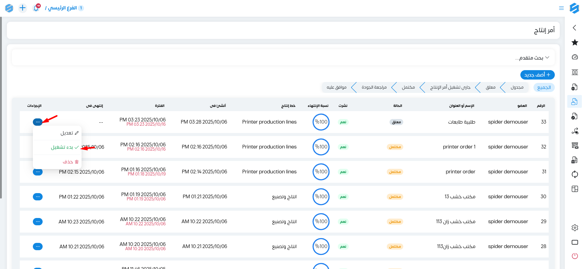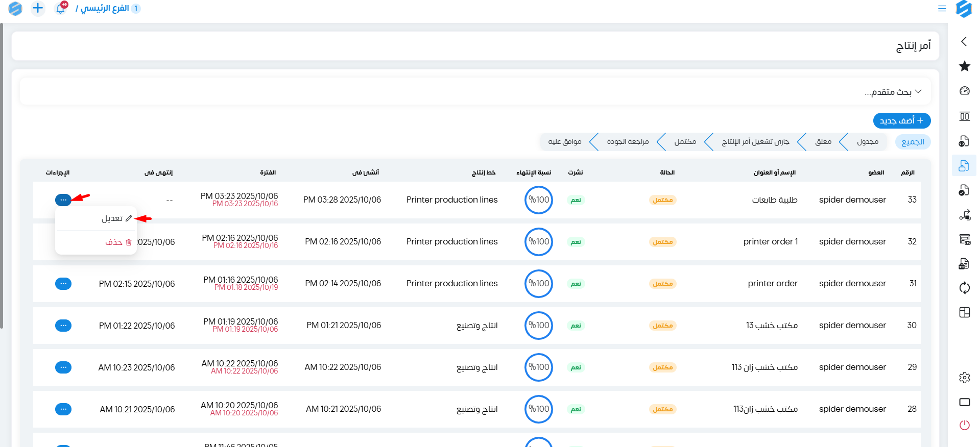 نقدر نعمل تعديل على أمر الانتاج من خلال الدخول على الاجراءات واختيار تعديل.