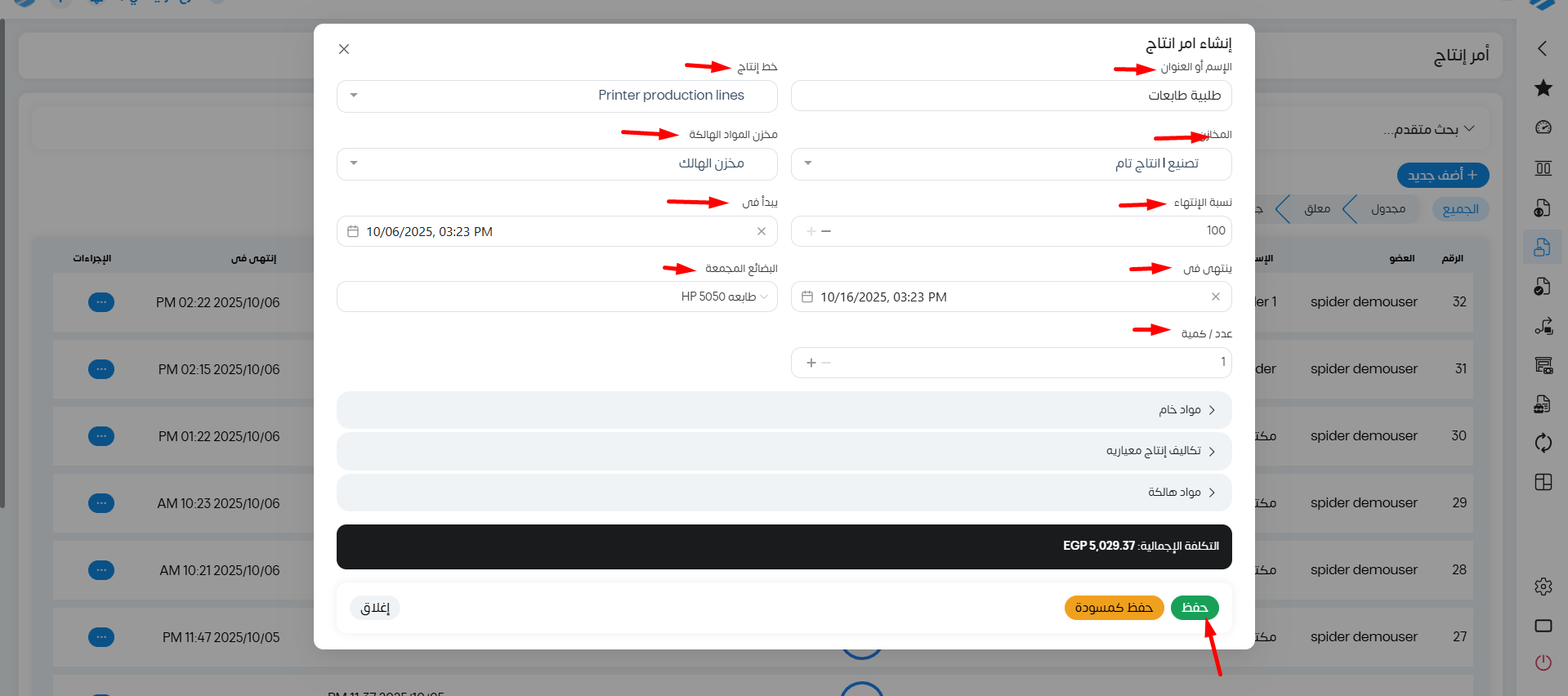 نسجل اسم أمر الإنتاج وخط الإنتاج الخاص بهذا الامر . ونختار المخزن الذى ستذهب اليه المنتجات المصنعة ومخزن المواد الهالكة وتاريخ البدء والإنتهاء واسم الصنف المصنع والعدد المطلوب لامر الانتاج ثم نضغط حفظ.