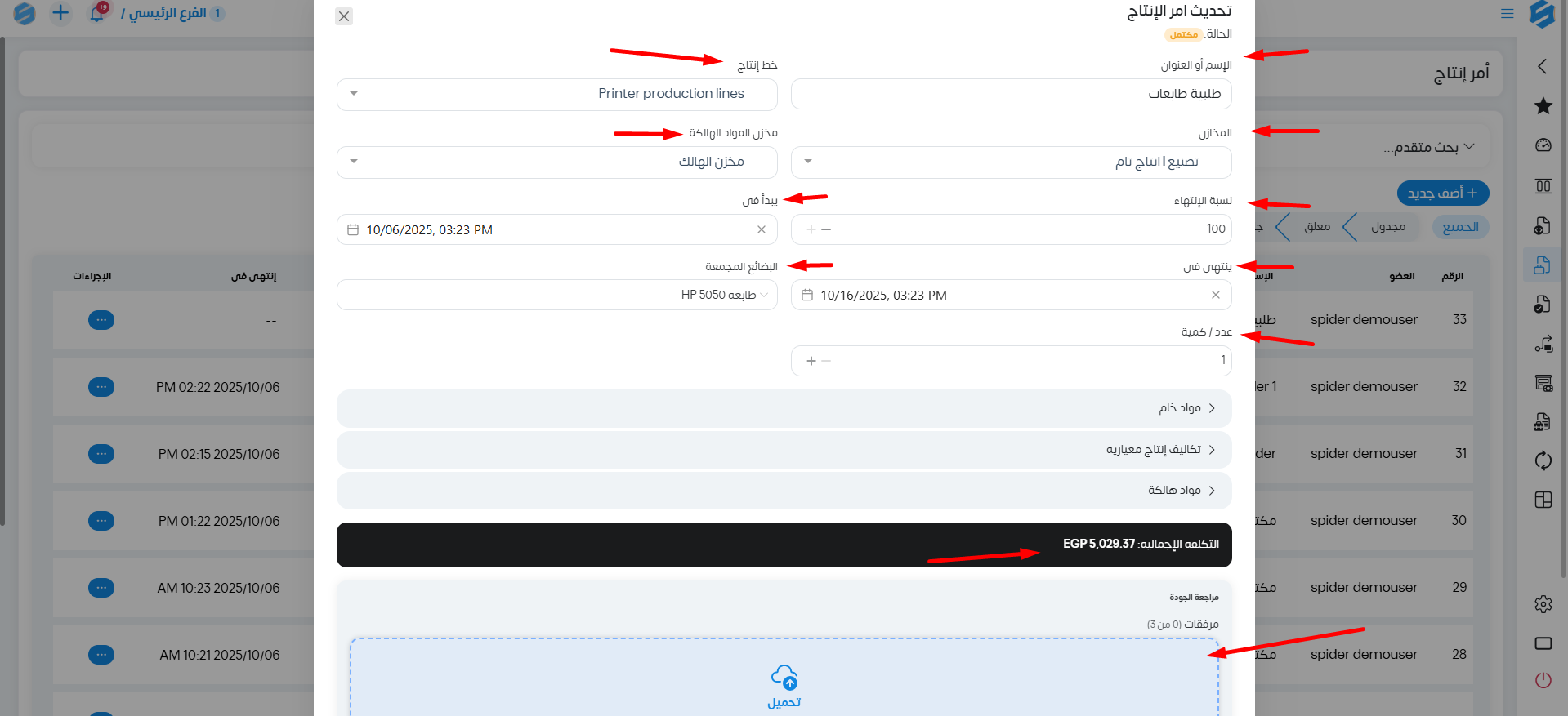 بعد الضغط على التعديل هيظهر بالشكل الاتى نعمل اى تعديل على أمر الانتاج والضغط على تعديل.