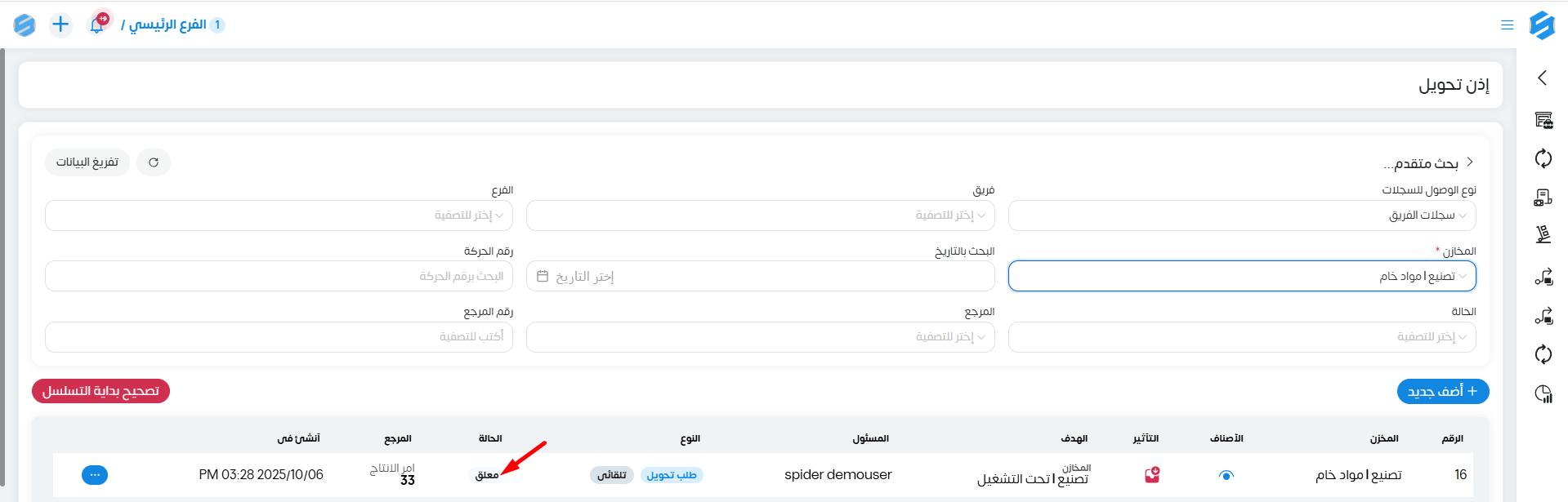 بعد ان بدأنا التشغيل هذا سوف يرمي اذن تحويل معلق في المخزن.