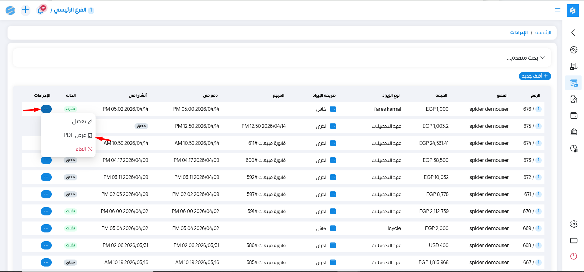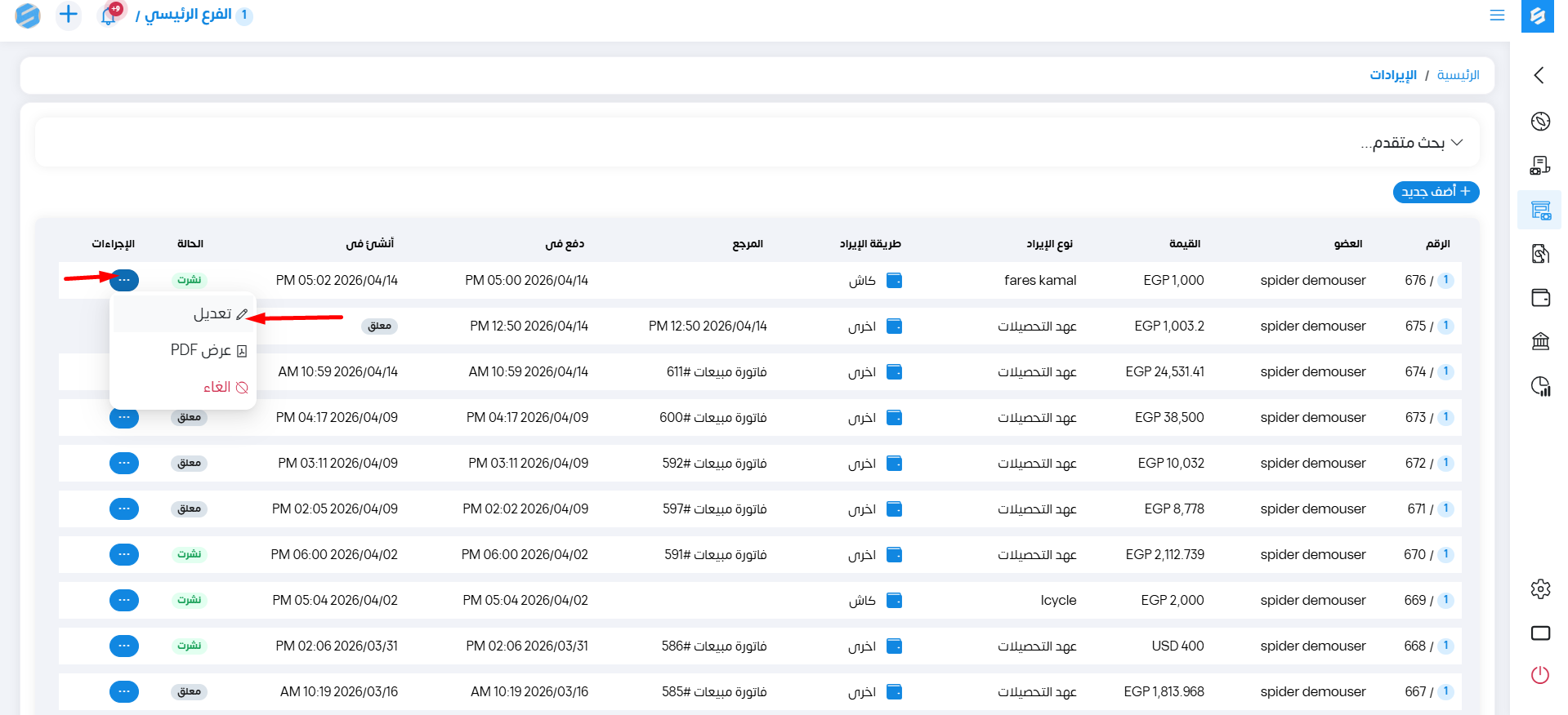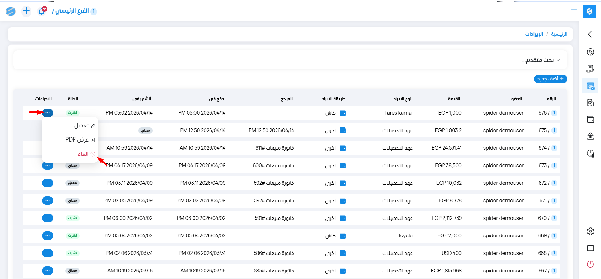 يمكننا عمل بعض الإجراءات على الإيرادات من خلال خانة الإجراءات عند الضغط عليها تظهر قائمة كالتالي: