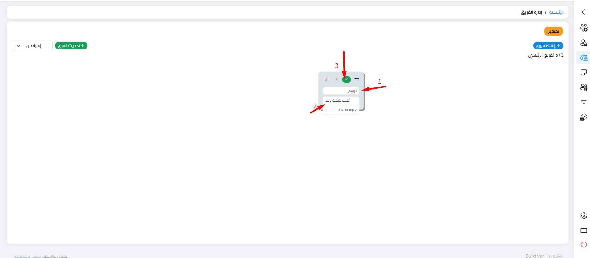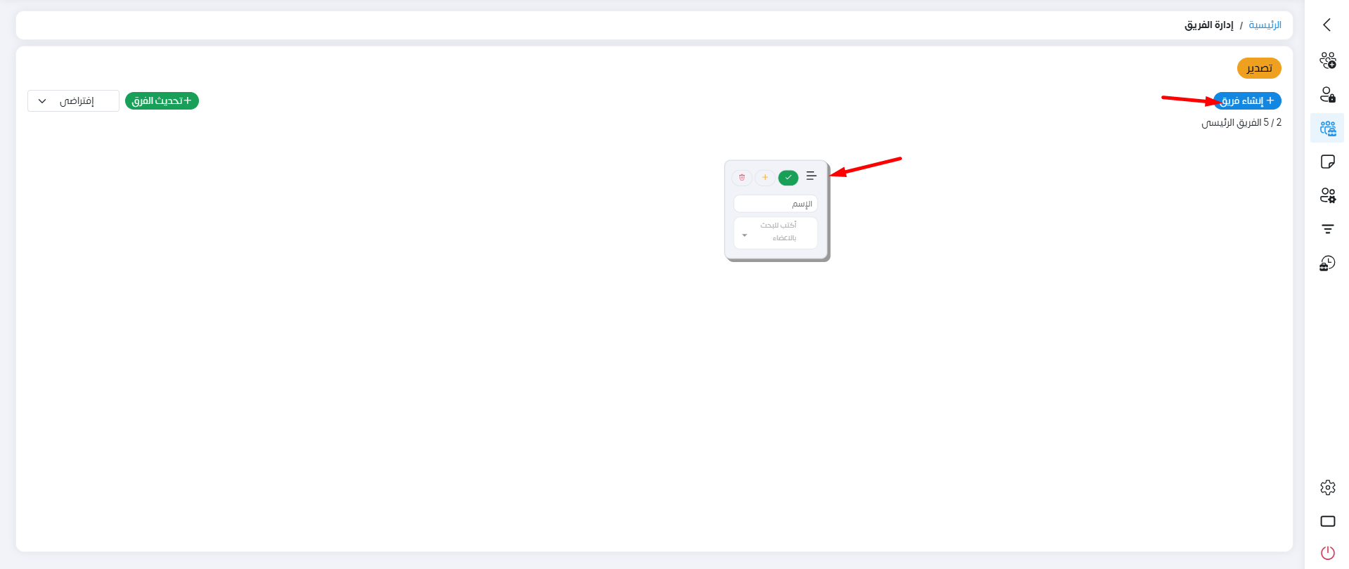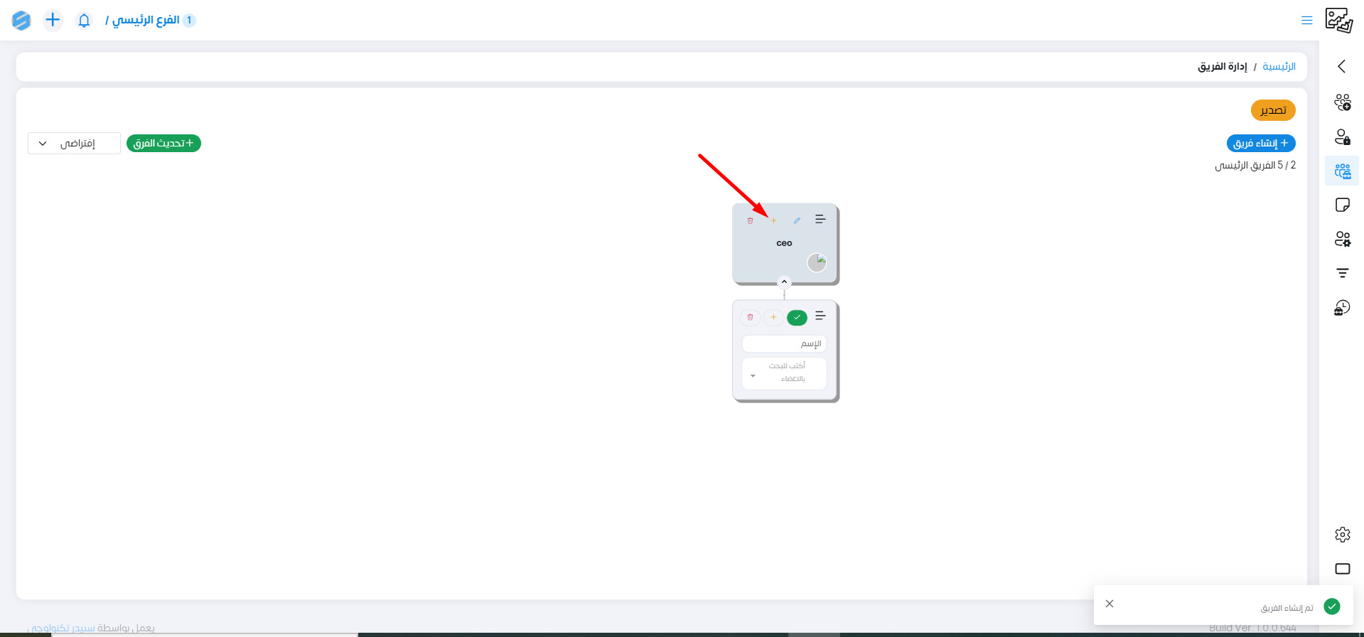 نقوم بالضغط على انشاء فريق فيظهر لنا اول خانة في الفريق وهو الشخص المسئول عن جميع الفرق والاعضاء (بشكل كبير المدير التنفيذي للشركة):