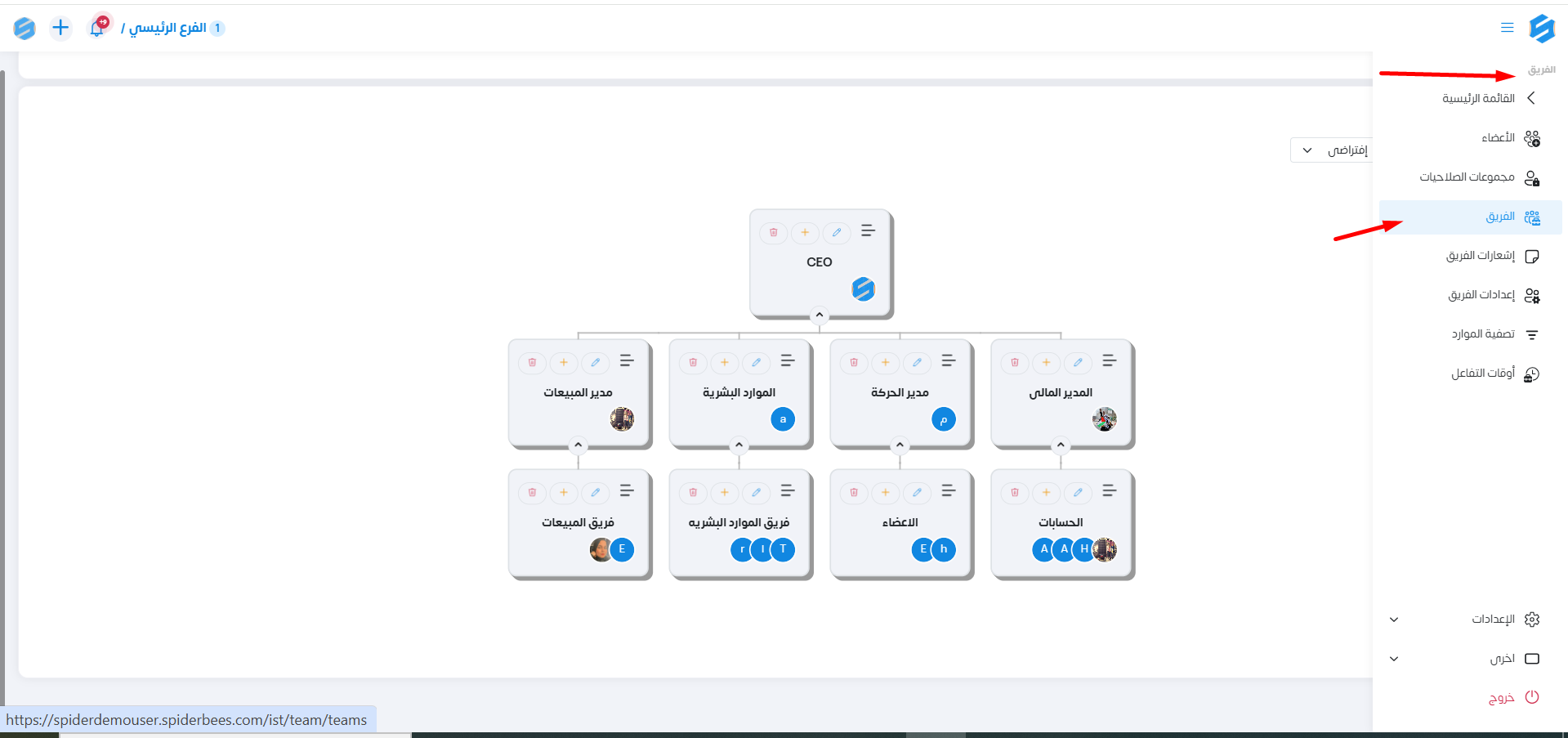 يمكننا إنشاء تسلسل هرمي للفرق نقوم من خلالها تبقسيم الشركة الى مديرين فرق واعضاء عن طريق: