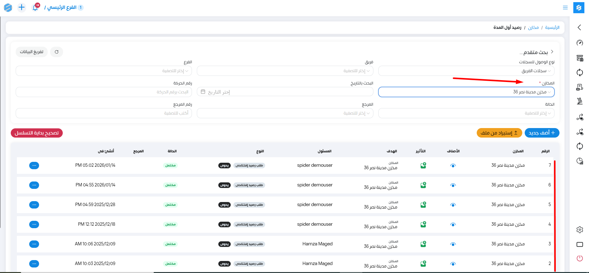 - عند أختيار مخزن في البحث المتقدم يظهر لنا جميع حركات رصيد أول المدة التي تم عملها على هذا المخزن.