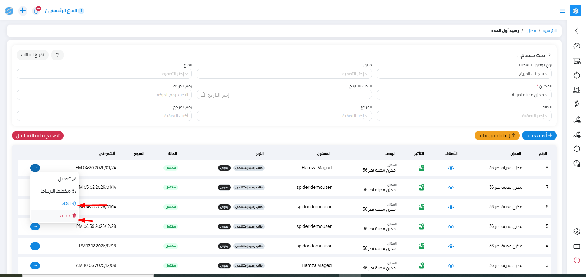 - يمكننا حذف حركة رصيد أول المدة أو إلغاؤها في حالة واحدة فقط أن تكون أخر حركة تم عملها .