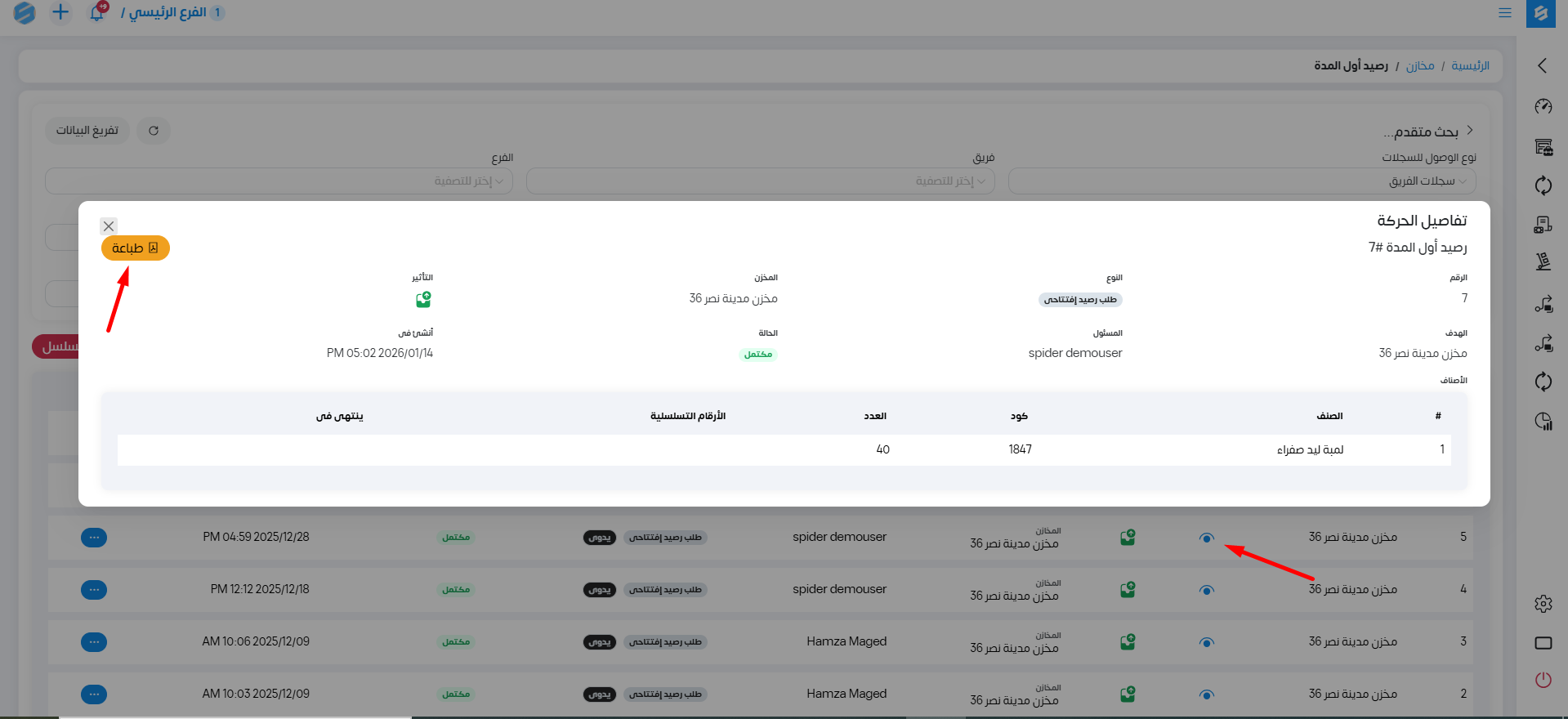 - يمكننا طباعة حركة إضافة رصيد أول المدة من خلال الضغط على أيقونة العين الموجودة في خانة الأصناف ثم طباعة.
