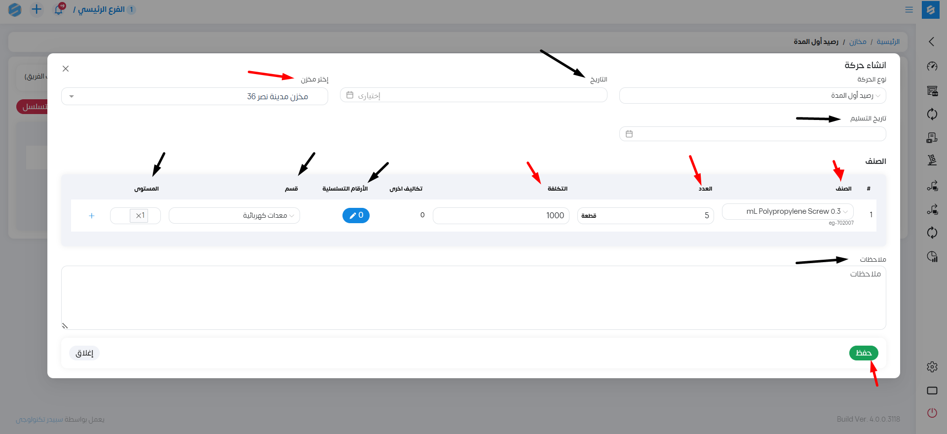 نقوم بتحديد المخزن الذي سنقوم بإضافة الرصيد له ، الصنف ، العدد والتكلفة .