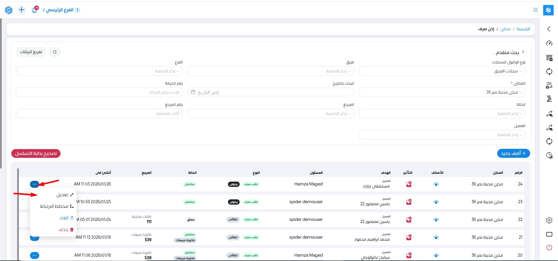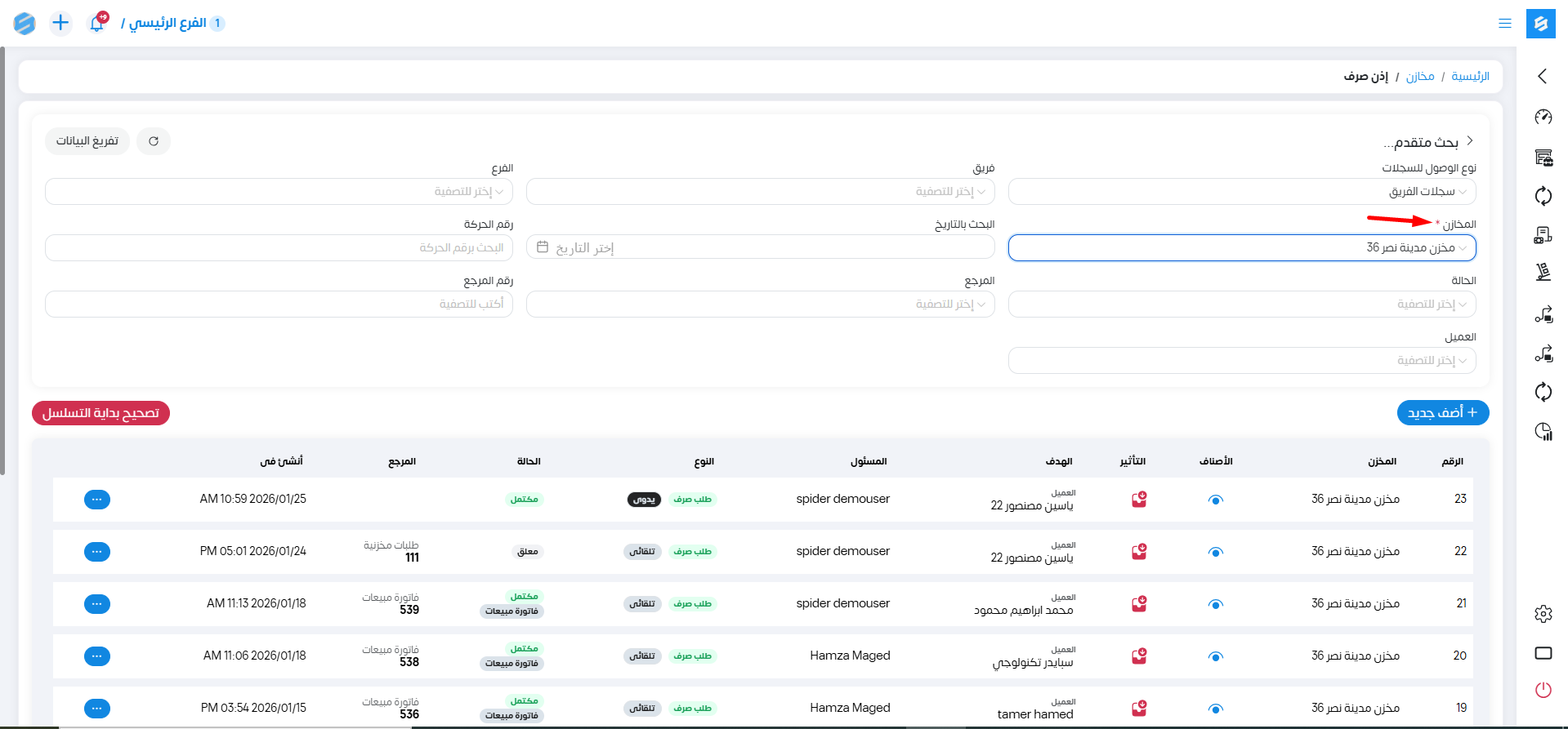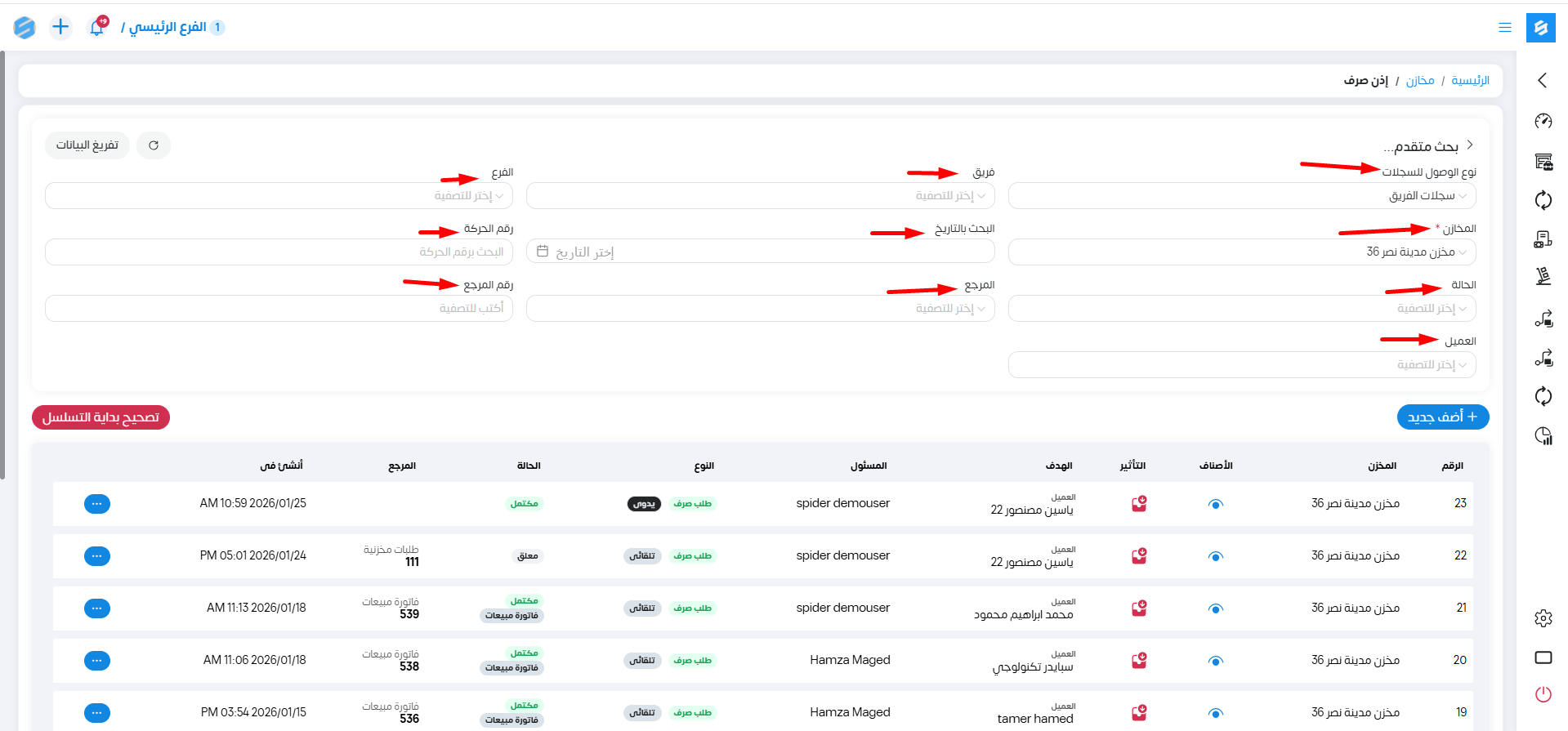 1- رقم الحركة. 2-المخزن الذي تم عمل إذن الصرف منه 3-الأصناف مع امكانية عرضها.