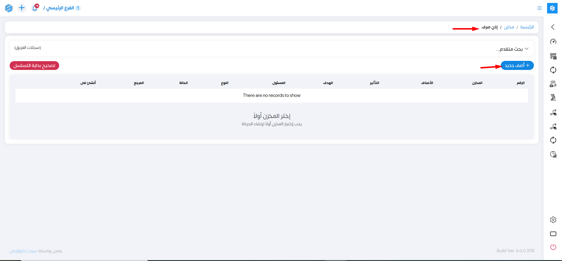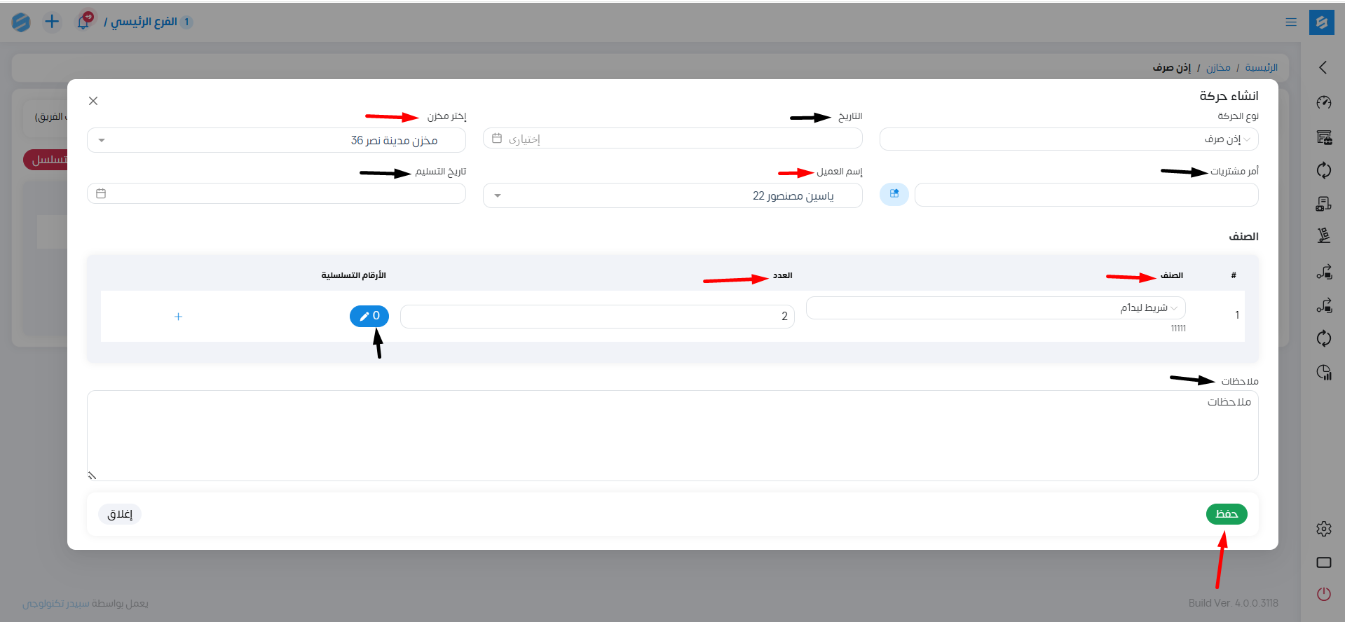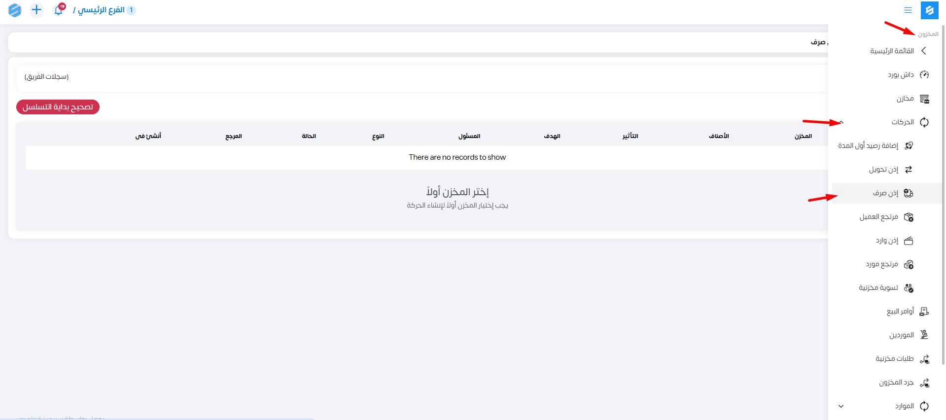 1- رقم الحركة. 2-المخزن الذي تم عمل إذن الصرف منه 3-الأصناف مع امكانية عرضها.