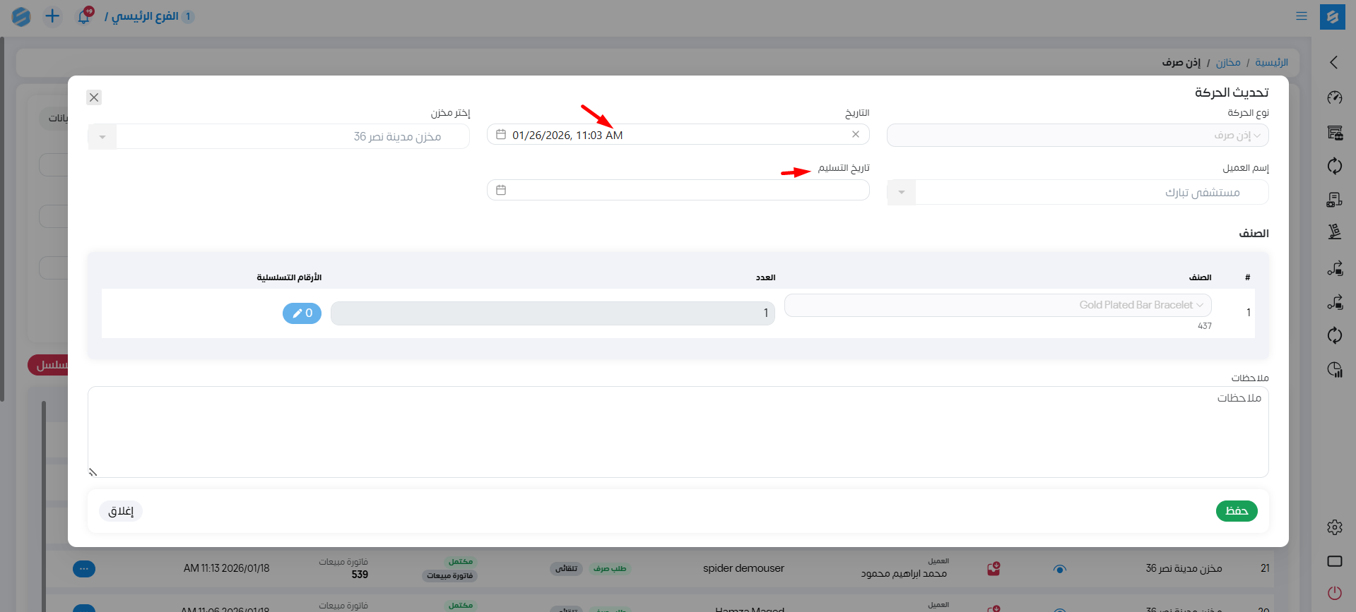 - يمكننا تعديل تاريخ الإنشاء وتاريخ التسليم في إذن الصرف.