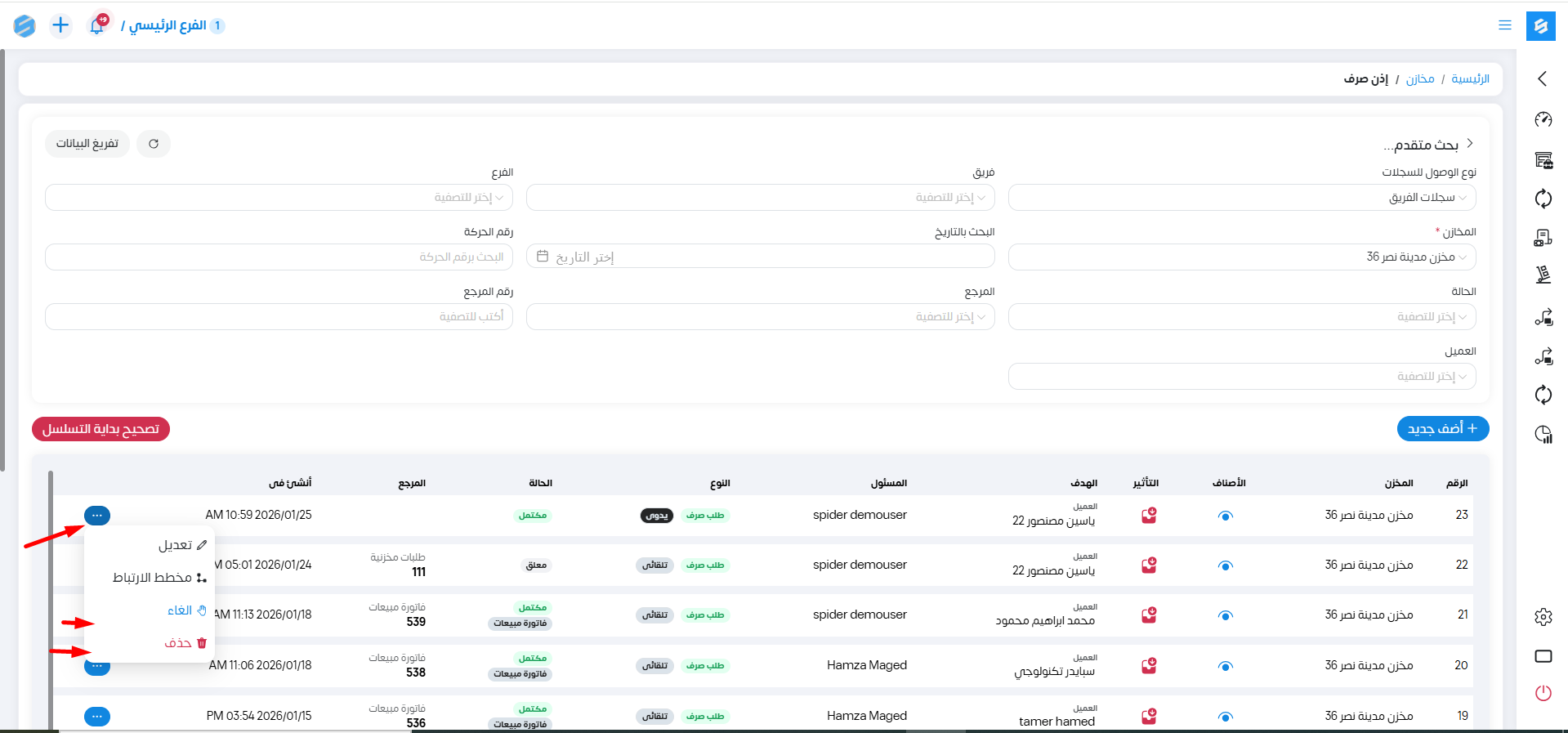 - يمكننا حذف حركة إذن الصرف أو إلغاؤها في حالة واحدة فقط أن تكون أخر حركة تم عملها .