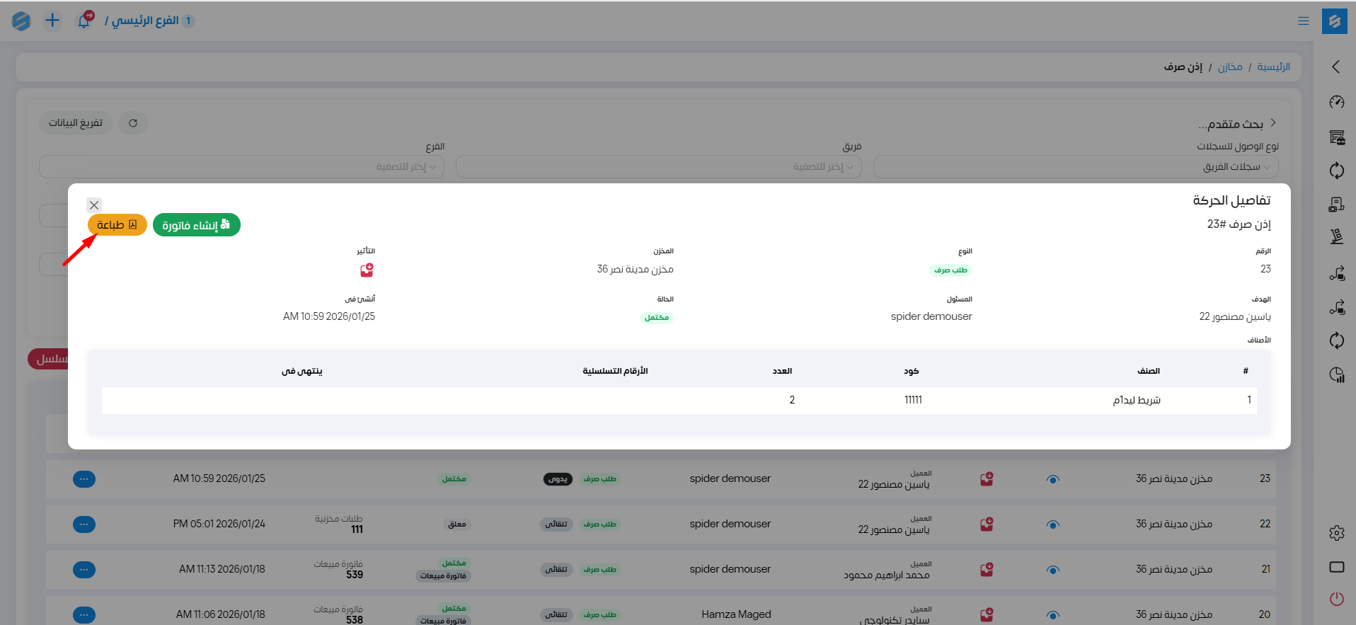 - يمكننا طباعة حركة إذن الصرف من خلال الضغط على أيقونة العين الموجودة في خانة الأصناف ثم طباعة.