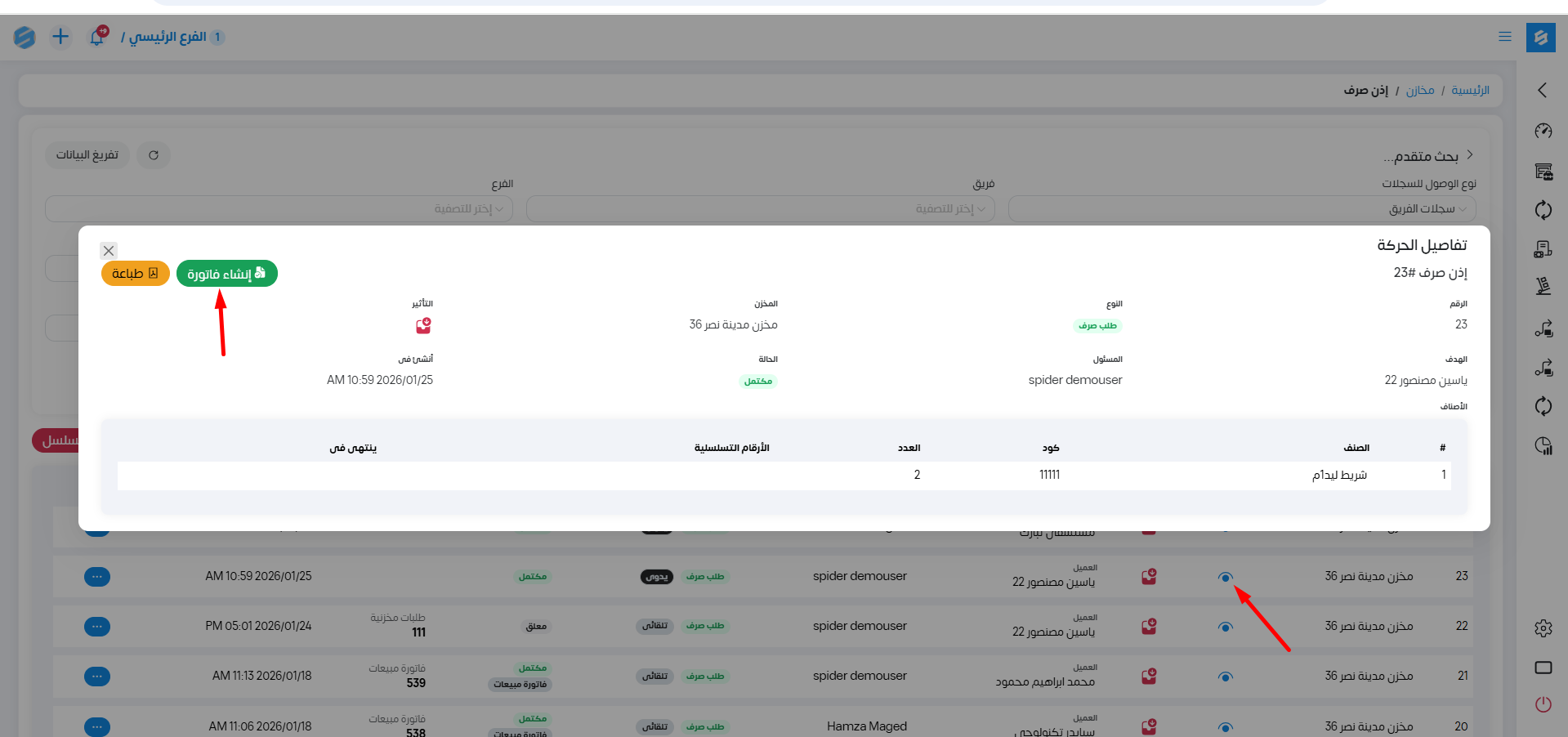 - يمكننا تحويل إذن الصرف إلى فاتورة مبيعات من خلال الضغط على أيقونة العين الموجودة في خانة الأصناف ثم إنشاء فاتورة .