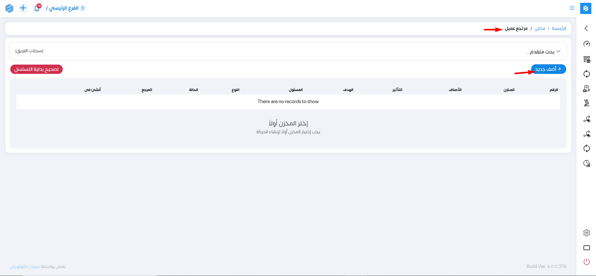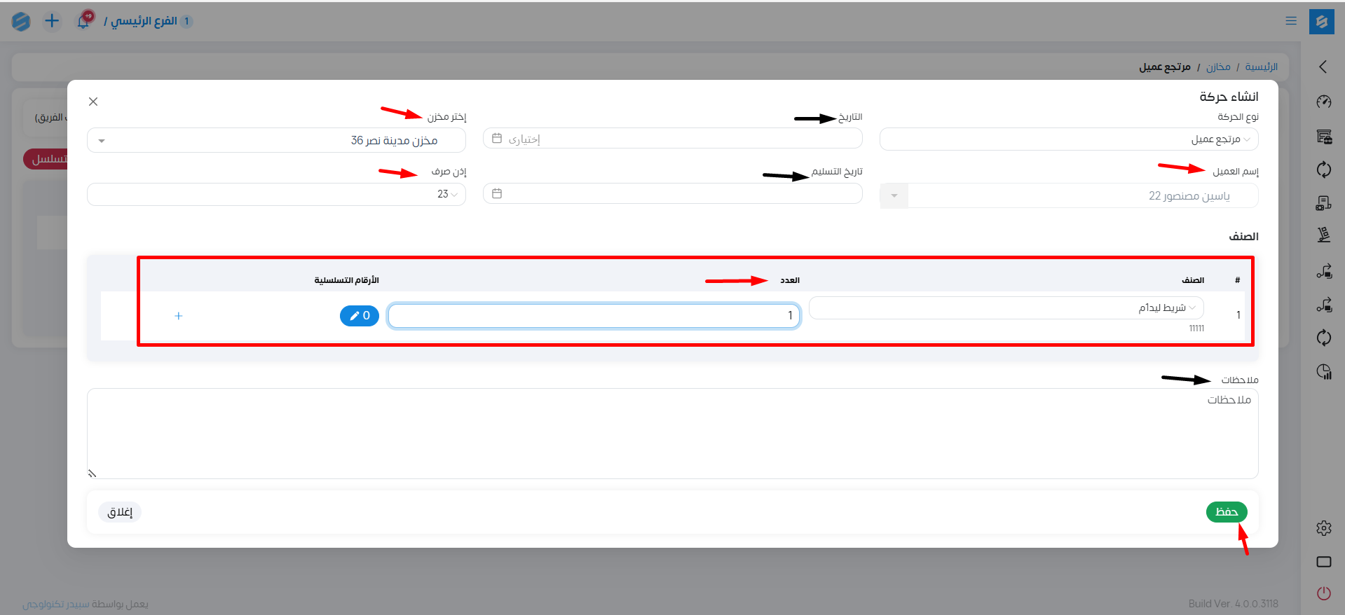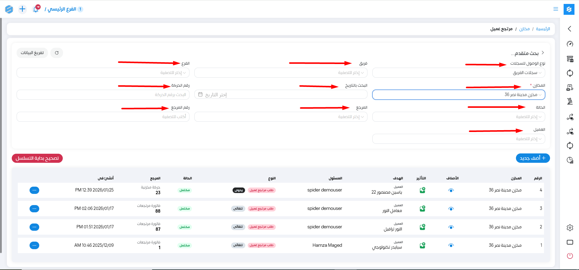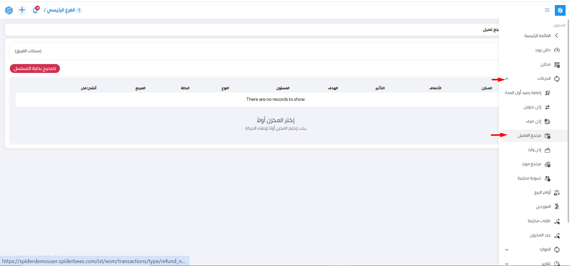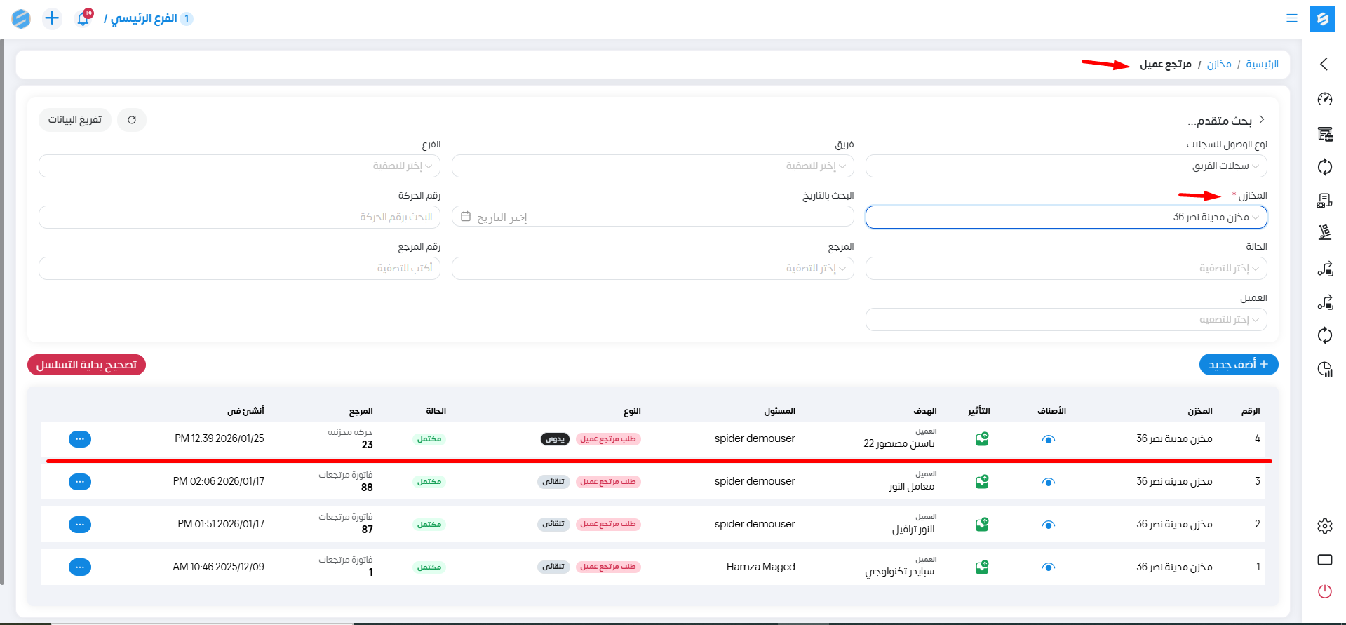 نختار من القائمة الجانبية حركات ثم مرتجع العميل.