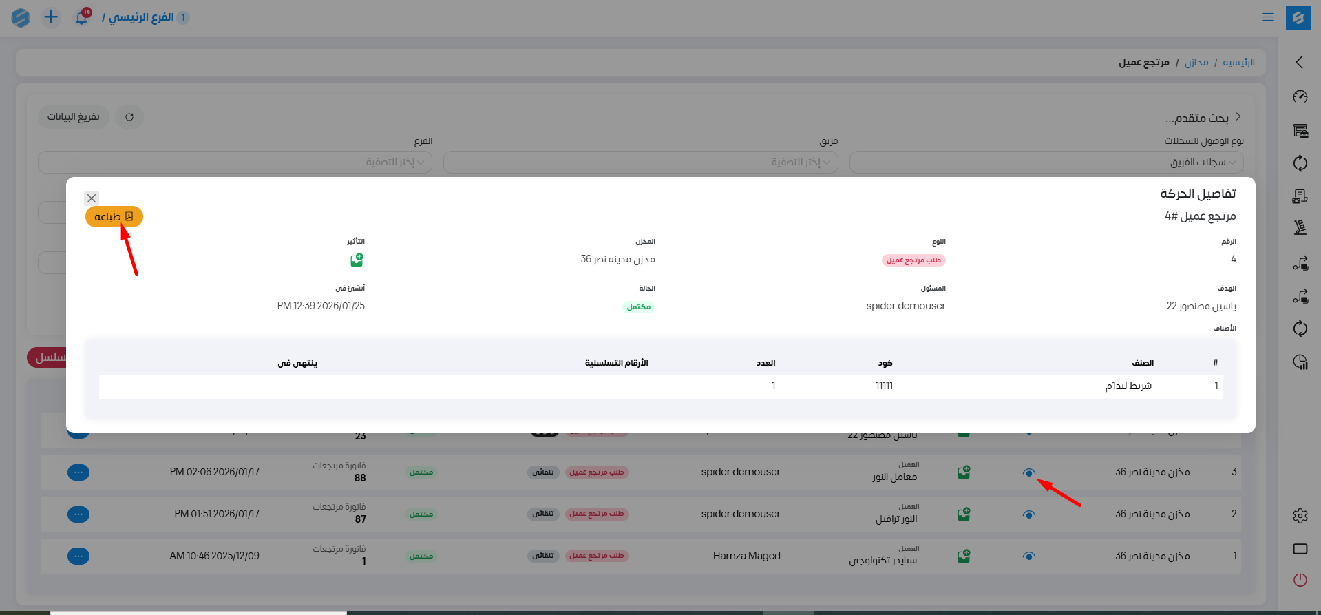 - يمكننا طباعة حركة مرتجع العميل من خلال الضغط على أيقونة العين الموجودة في خانة الأصناف ثم طباعة.