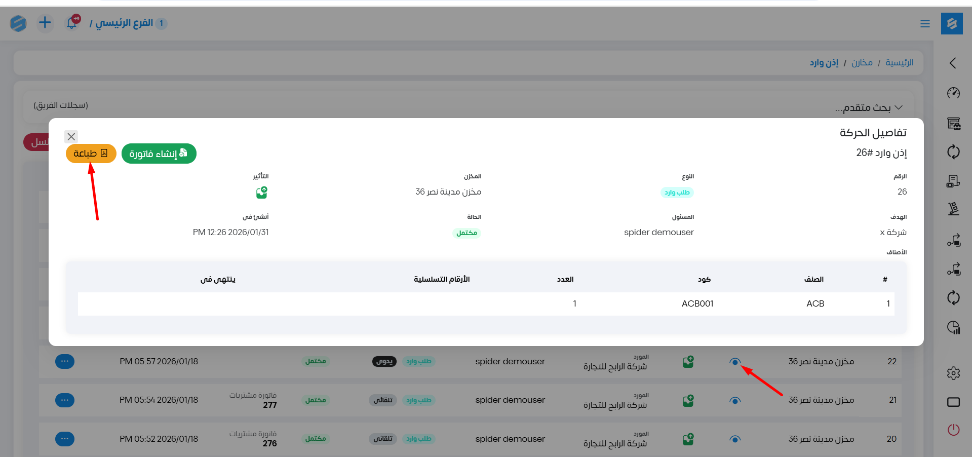 - يمكننا طباعة حركة إذن الوارد من خلال الضغط على أيقونة العين الموجودة في خانة الأصناف ثم طباعة.
