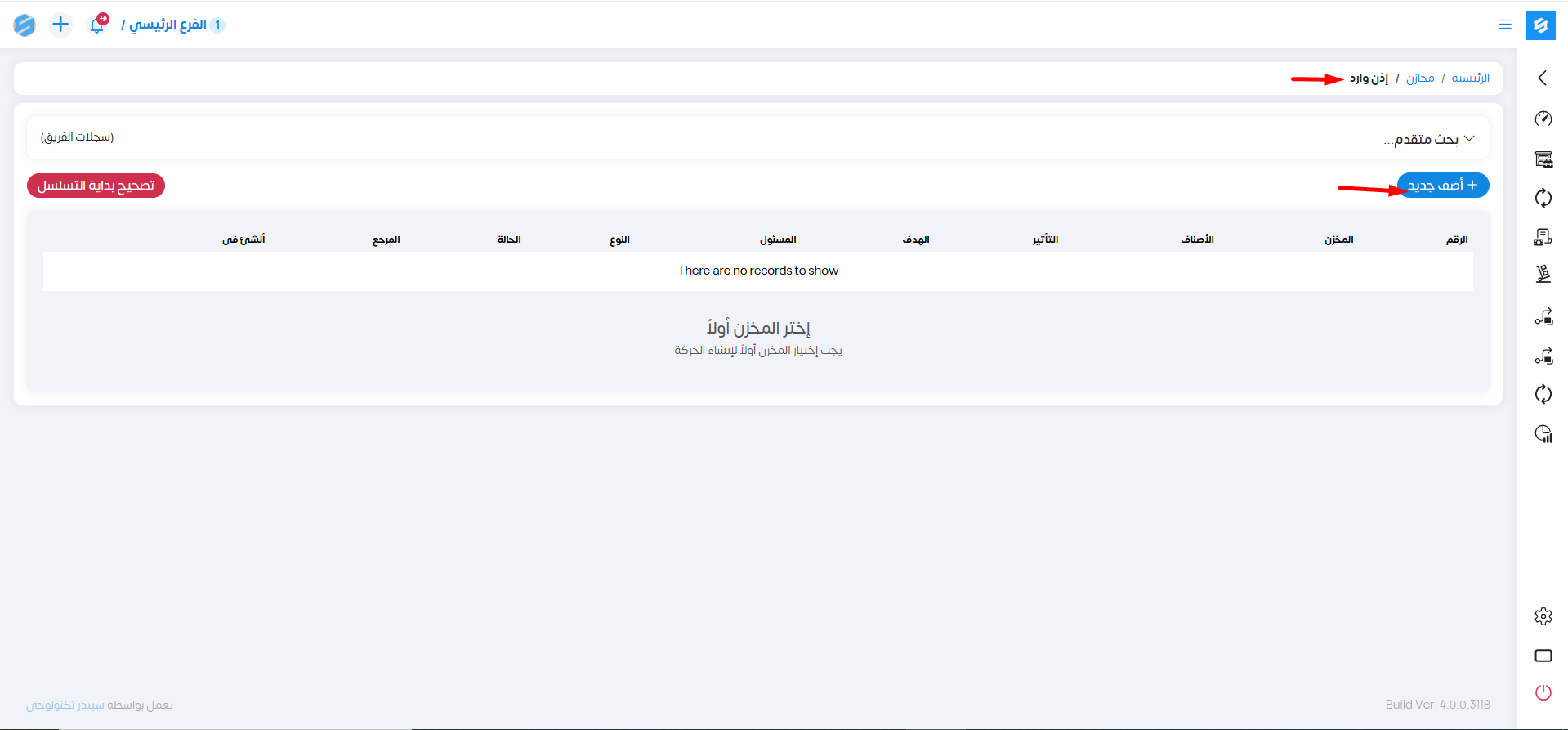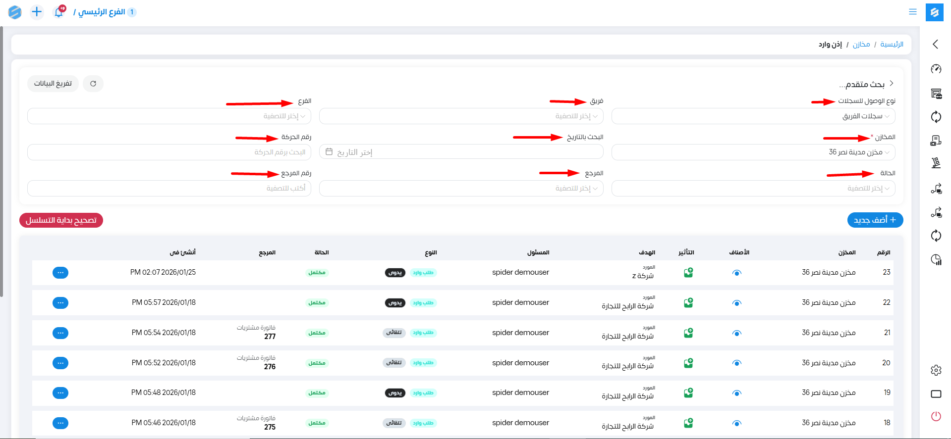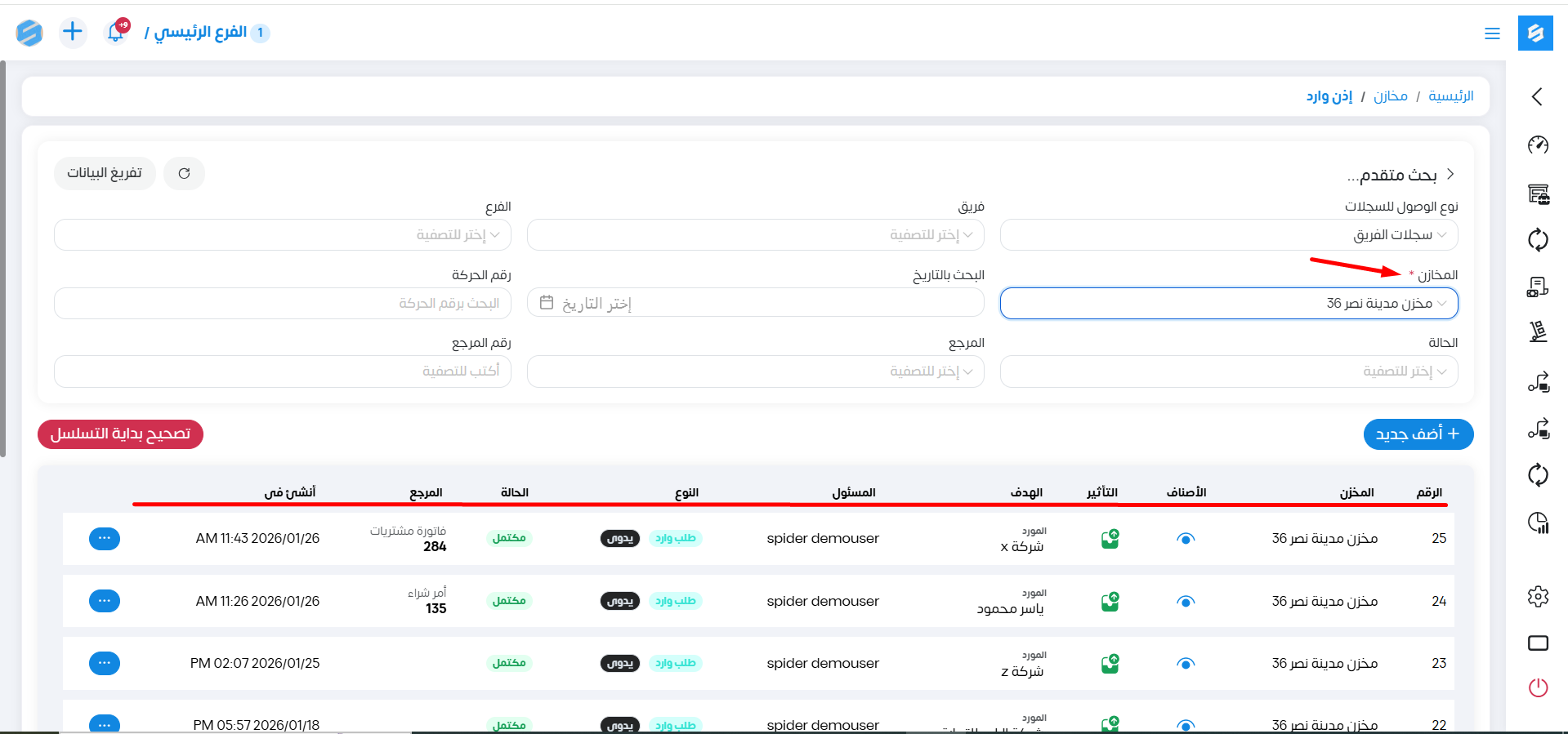 1- رقم الحركة. 2-المخزن الذي تم عمل إذن الوارد إليهه 3-الأصناف مع امكانية عرضها.