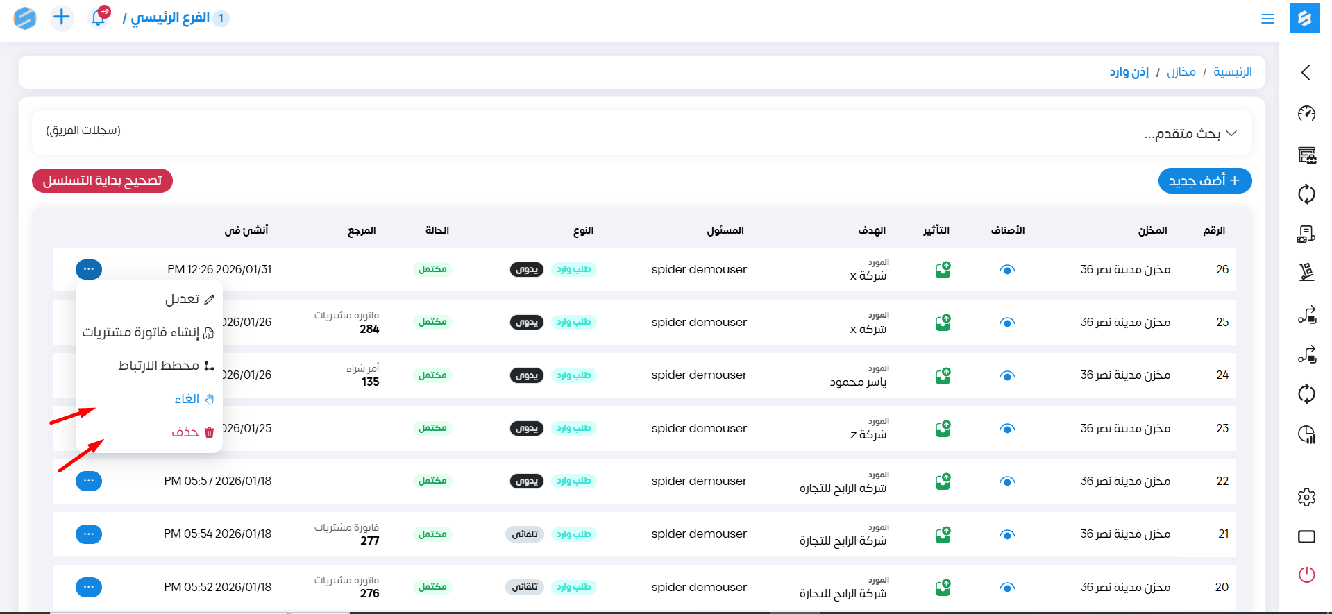 - يمكننا حذف حركة إذن الوارد أو إلغاؤها في حالة واحدة فقط أن تكون أخر حركة تم عملها .