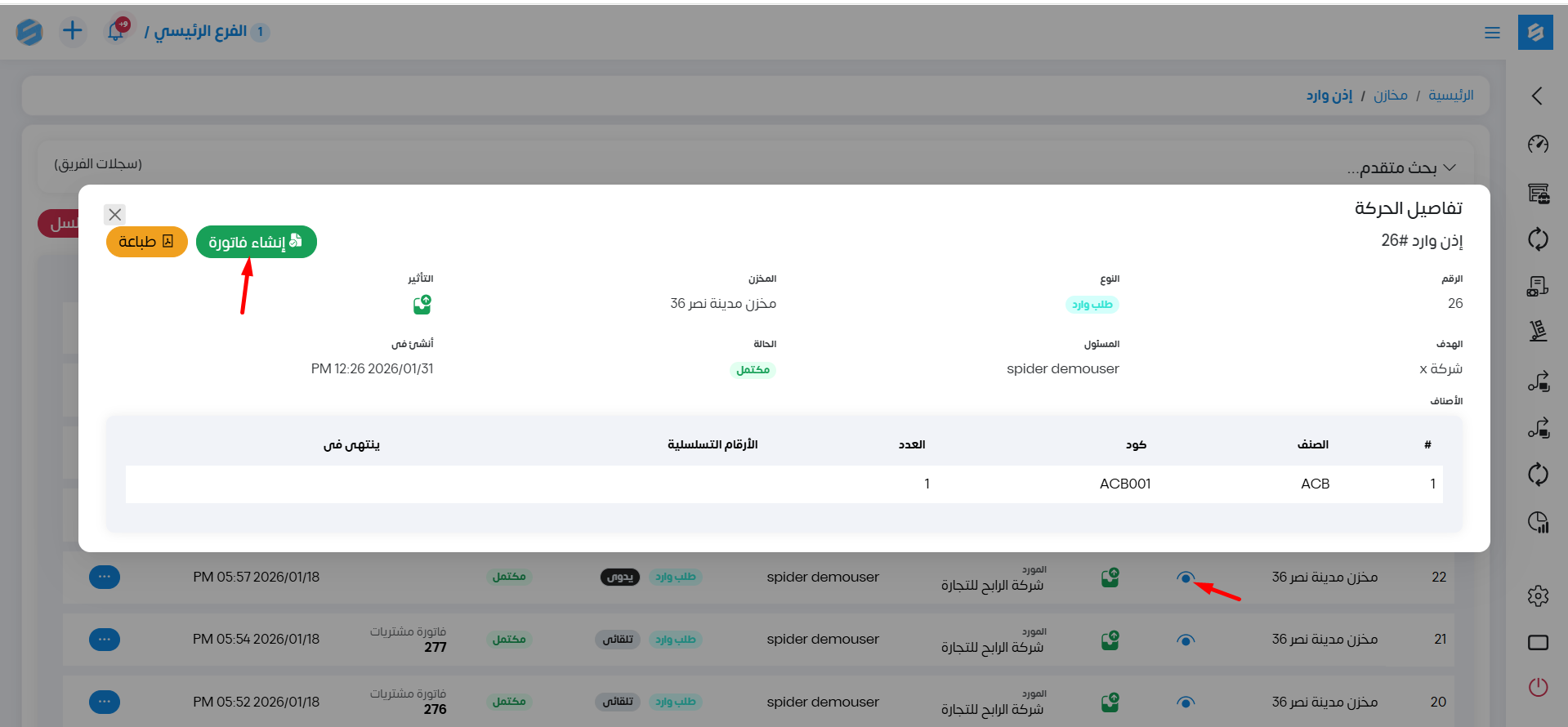 - يمكننا تحويل إذن الوارد إلى فاتورة مشتريات من خلال الضغط على أيقونة العين الموجودة في خانة الأصناف ثم إنشاء فاتورة .