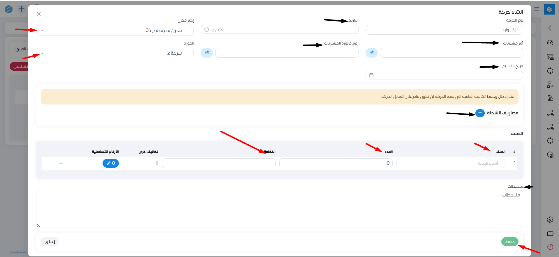 نقوم بإختيار المخزن الذي ستدخله البضائع ، نختار المورد، نحدد الأصناف، الكميات ، التكاليف.