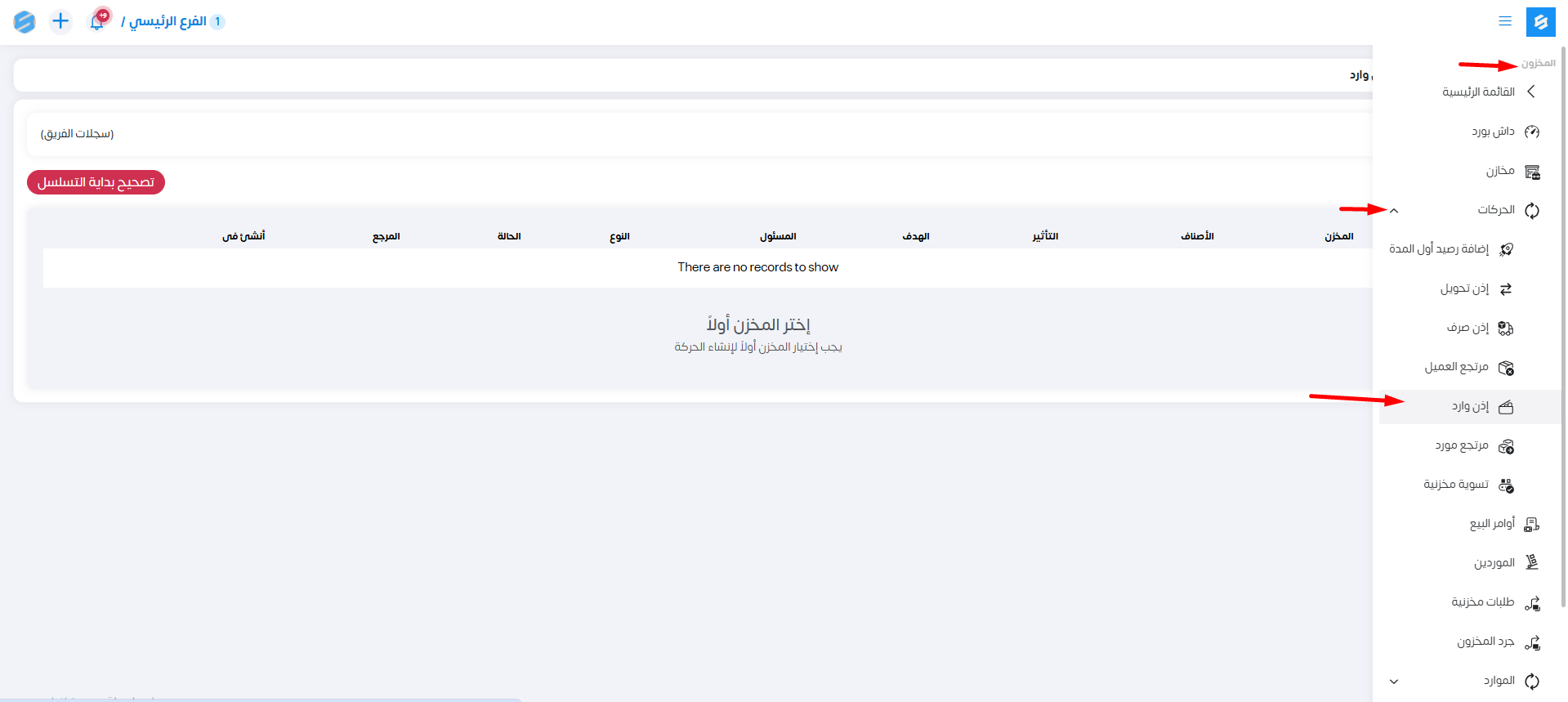 نختار من القائمة الجانبية حركات ثم إذن وارد.