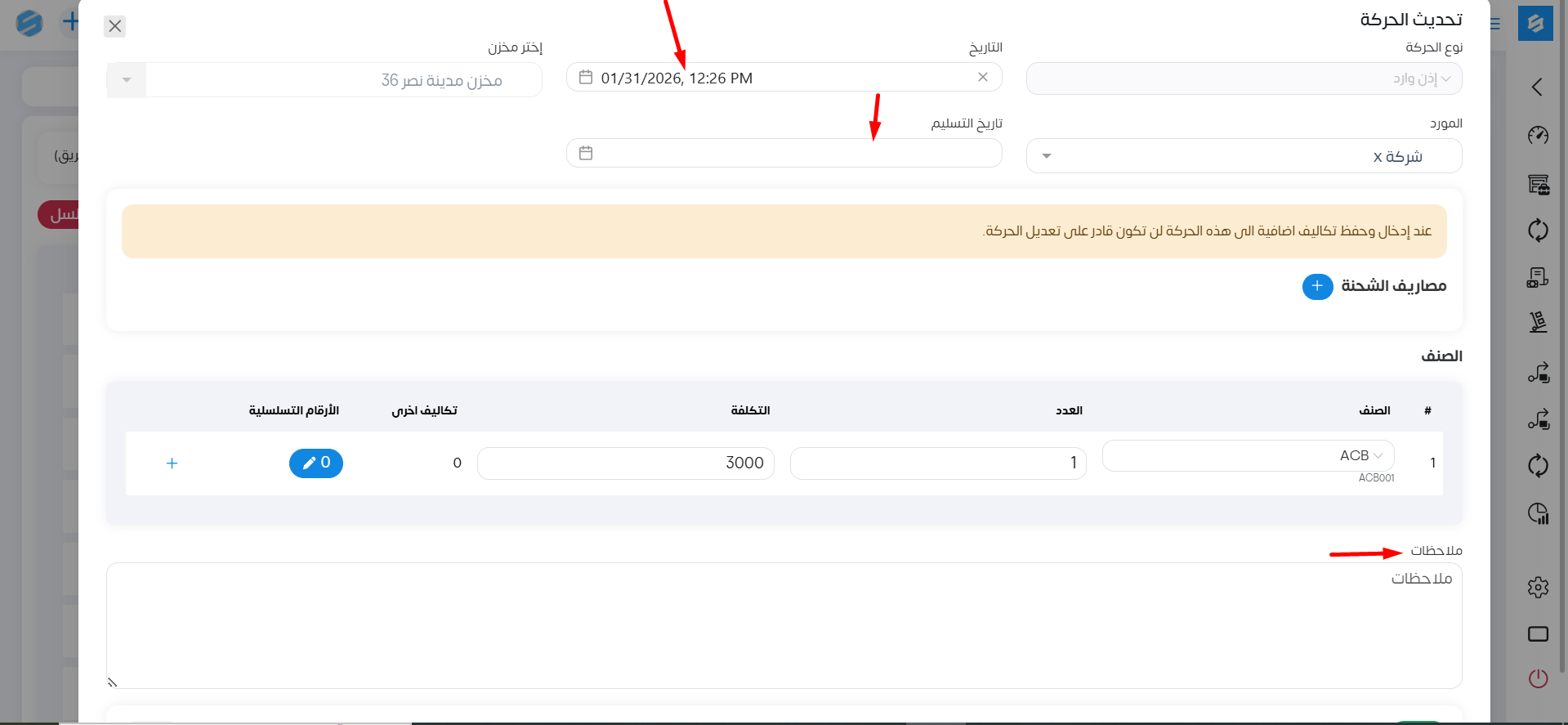- يمكننا تعديل تاريخ الإنشاء وتاريخ التسليم في إذن الوارد.