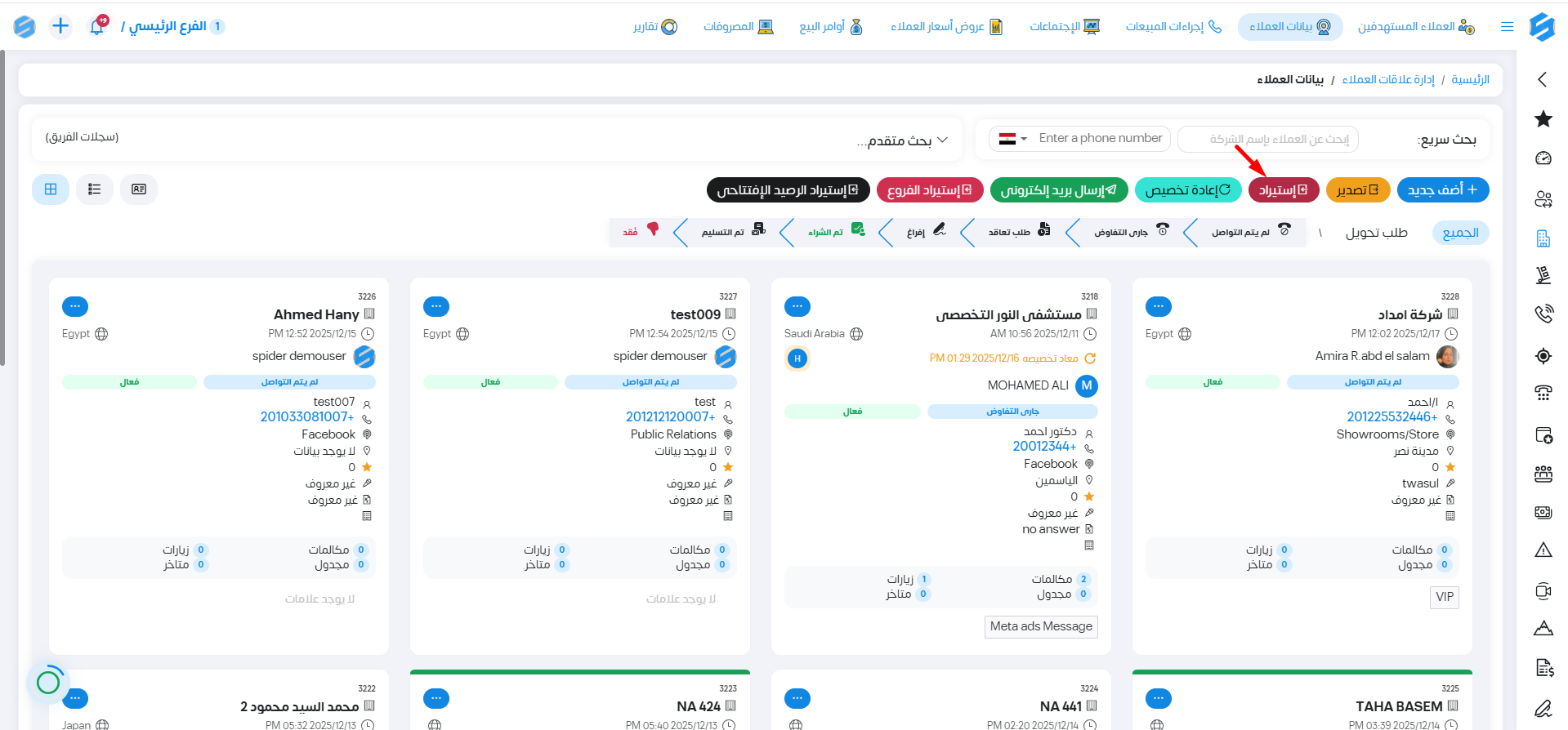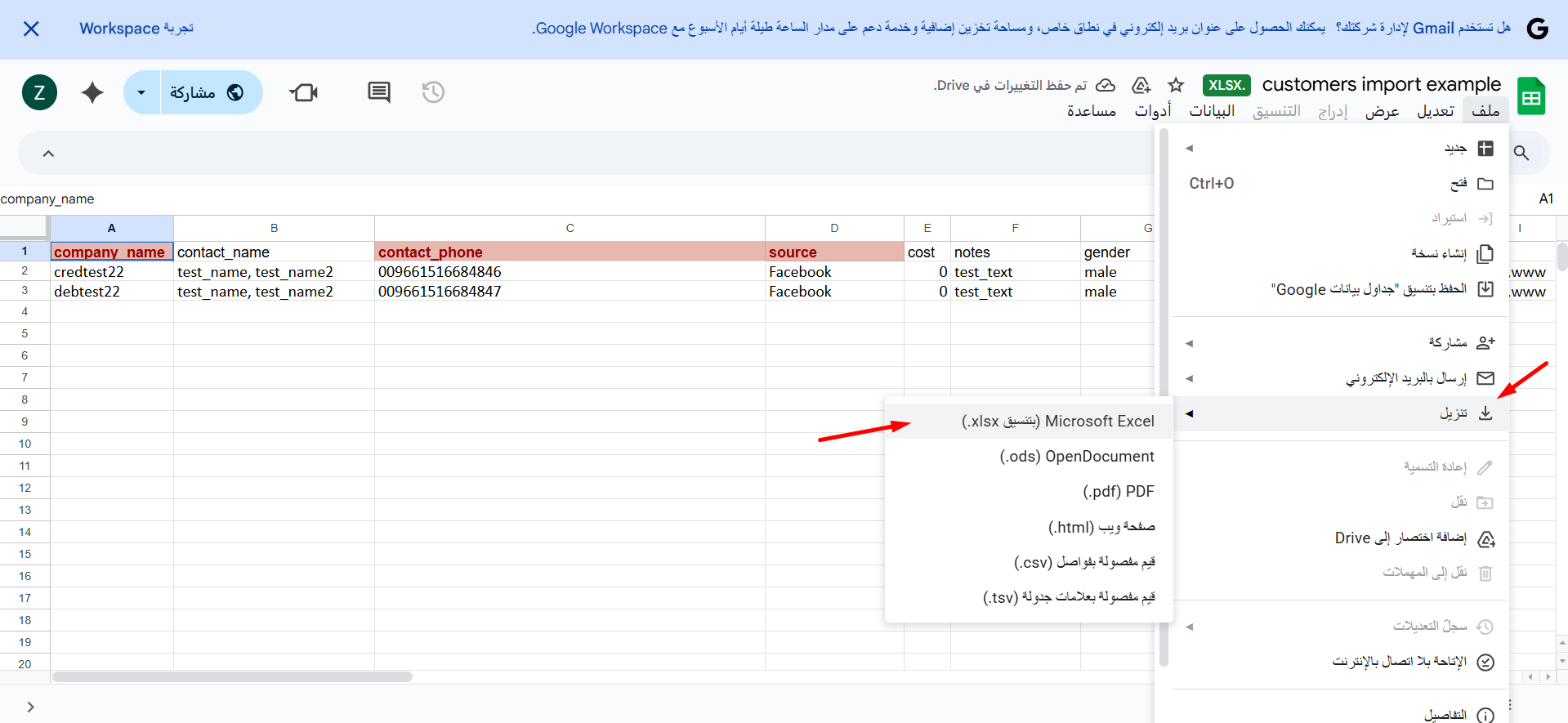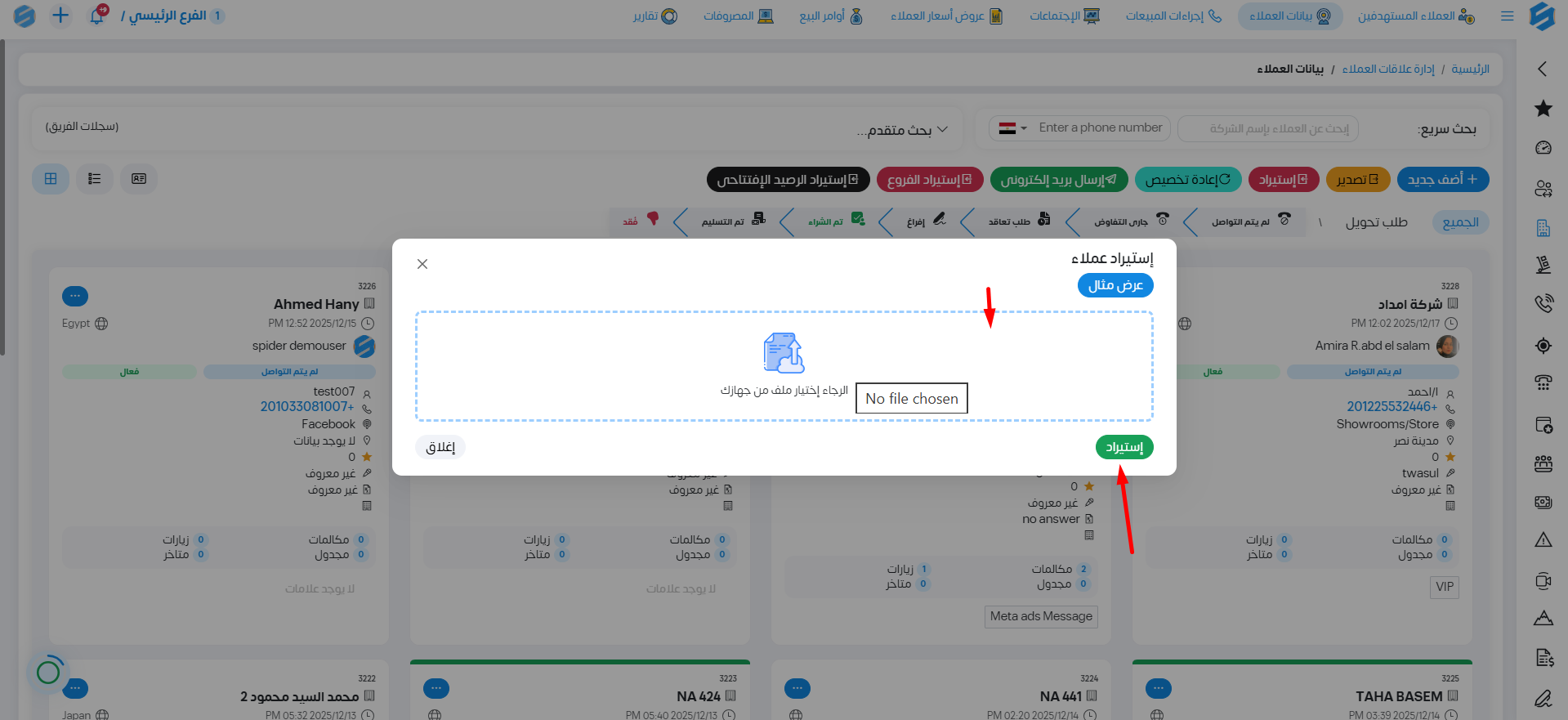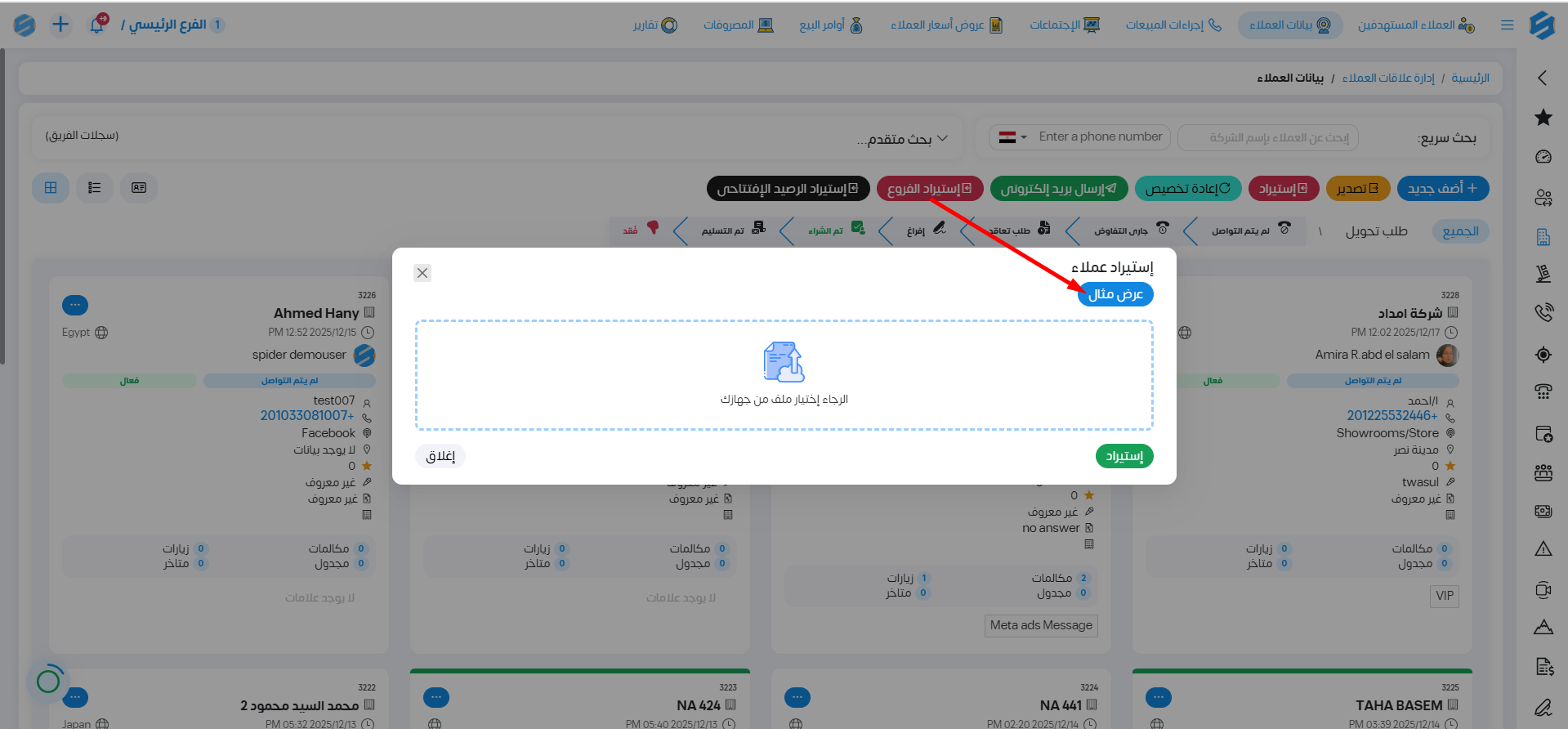 بالضغط على ”عرض مثال“، ثم الوصول إلى ”ملف“ والضغط عليه، وتحميل الملف لإضافة عملاء إليه، مع توفير مثال توضيحي لإضافة عملاء.