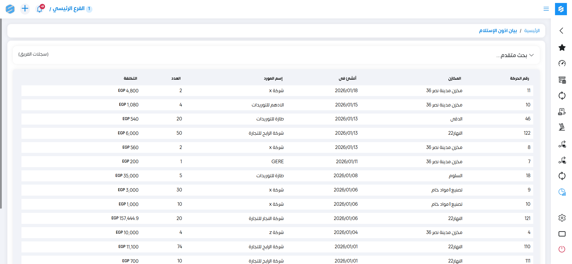فيظهر رقم الحركة ، المخزن الذي تم عمل الحركة عليه ، تاريخ انشاء الحركة ، اسم المورد ، العدد ، التكلفة .