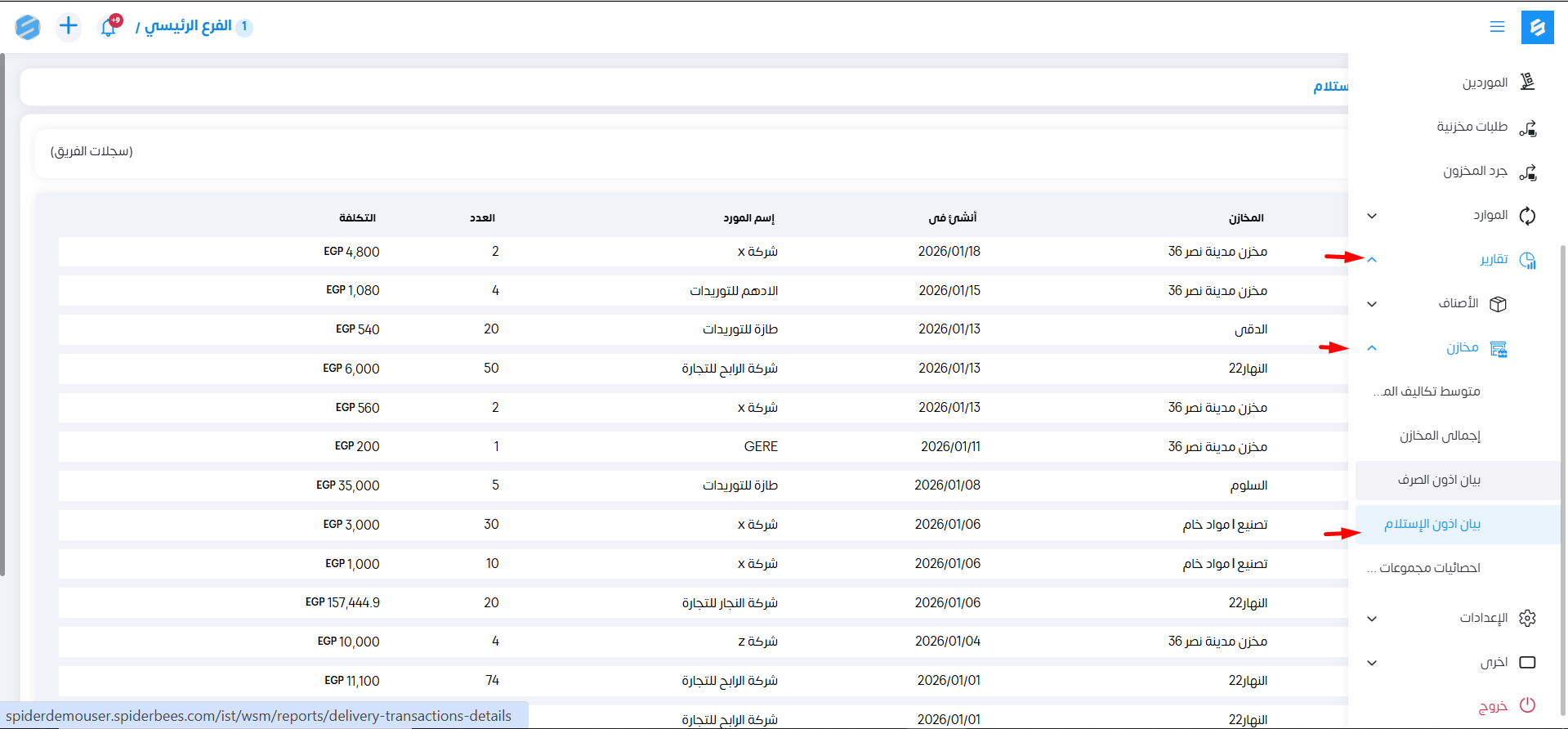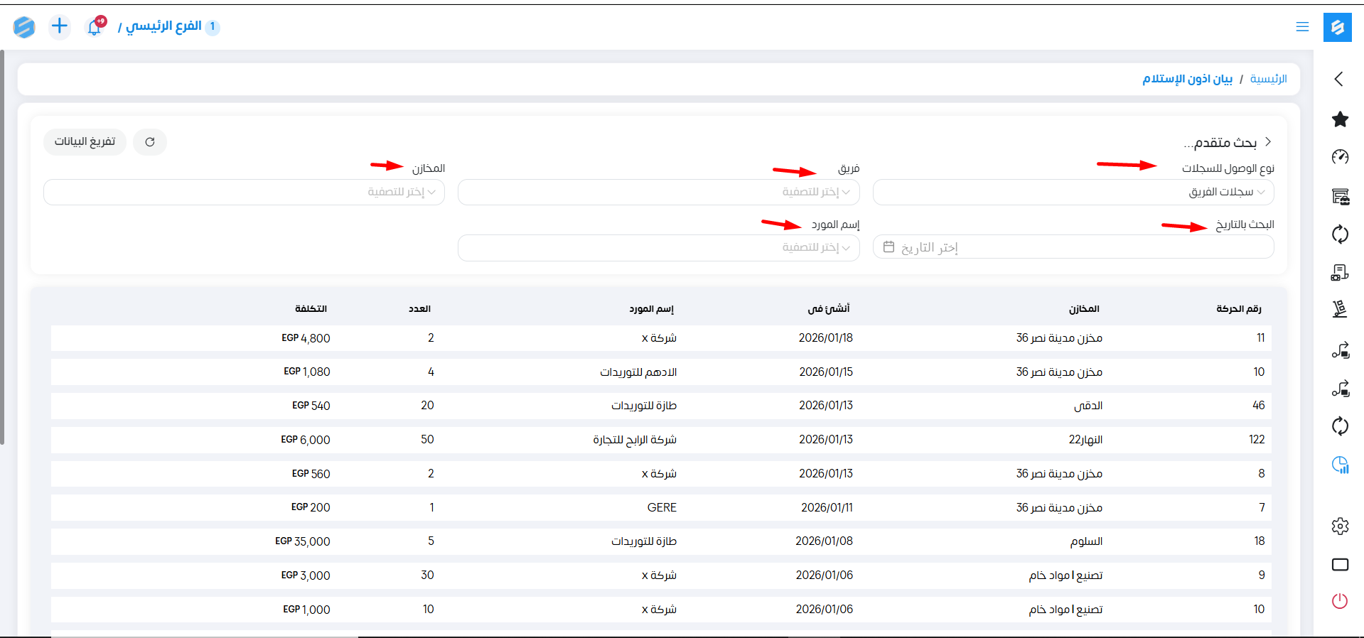 يظهر في هذا التقرير كل اذون الإستلام التي تم عملها على كل المخازن .