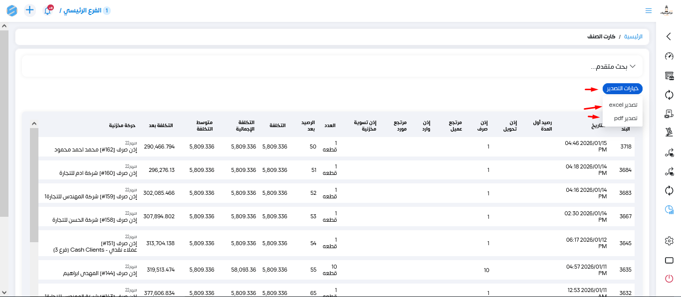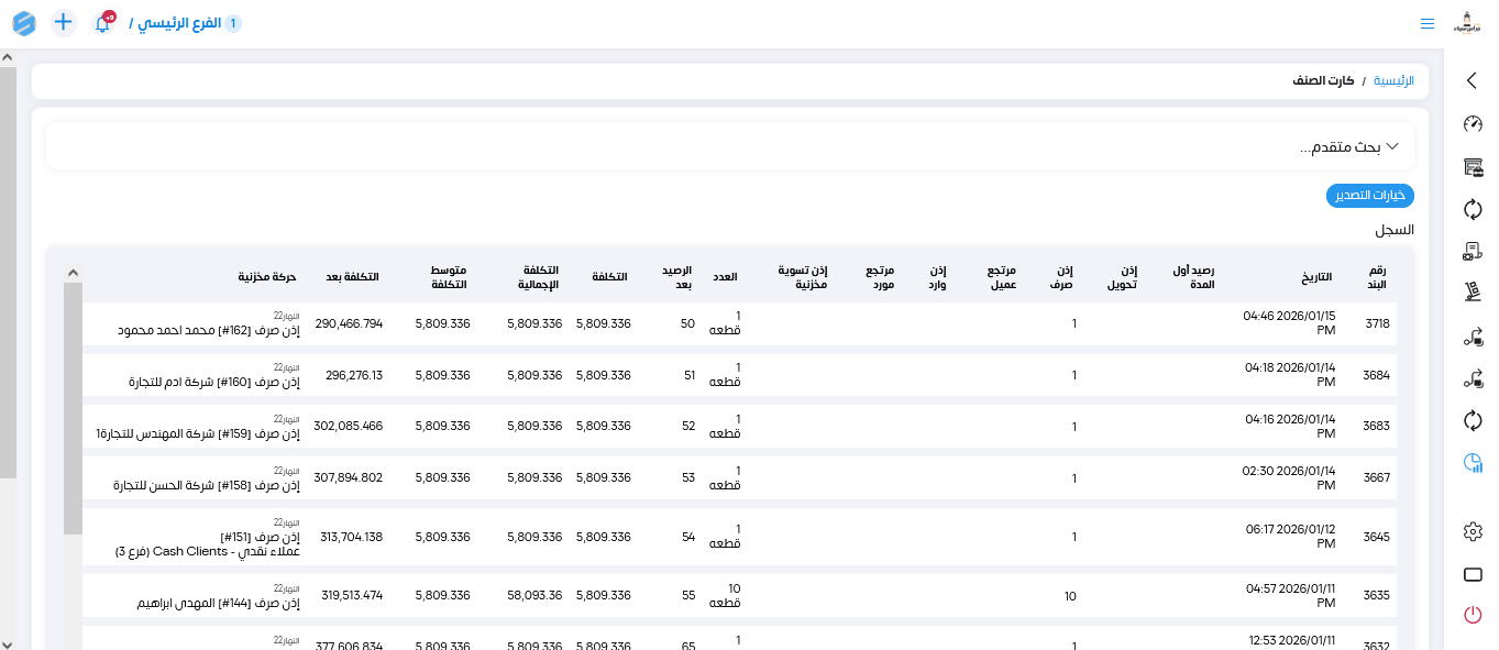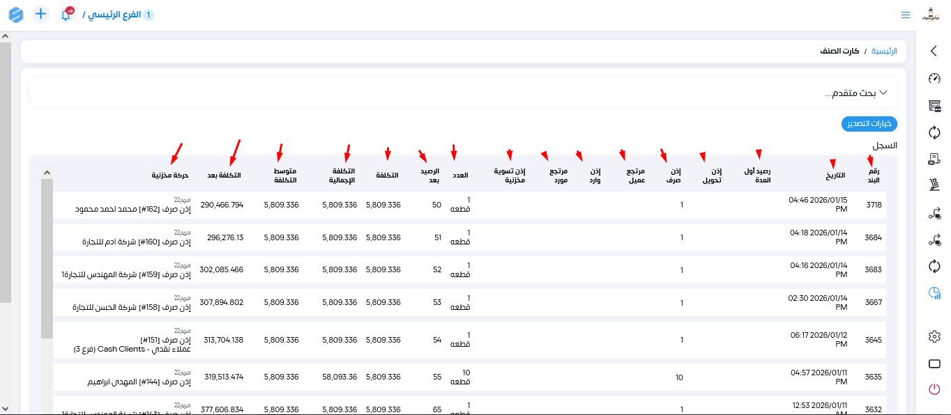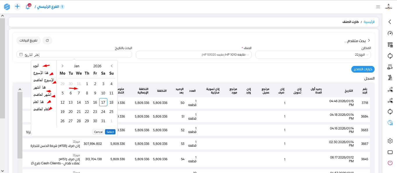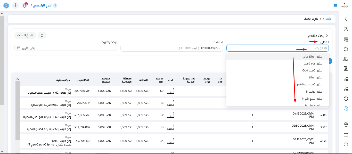 نقدر ندخل على التقرير من خلال المخازن تقارير وبعدين تقارير الاصناف وتقرير كارت الصنف