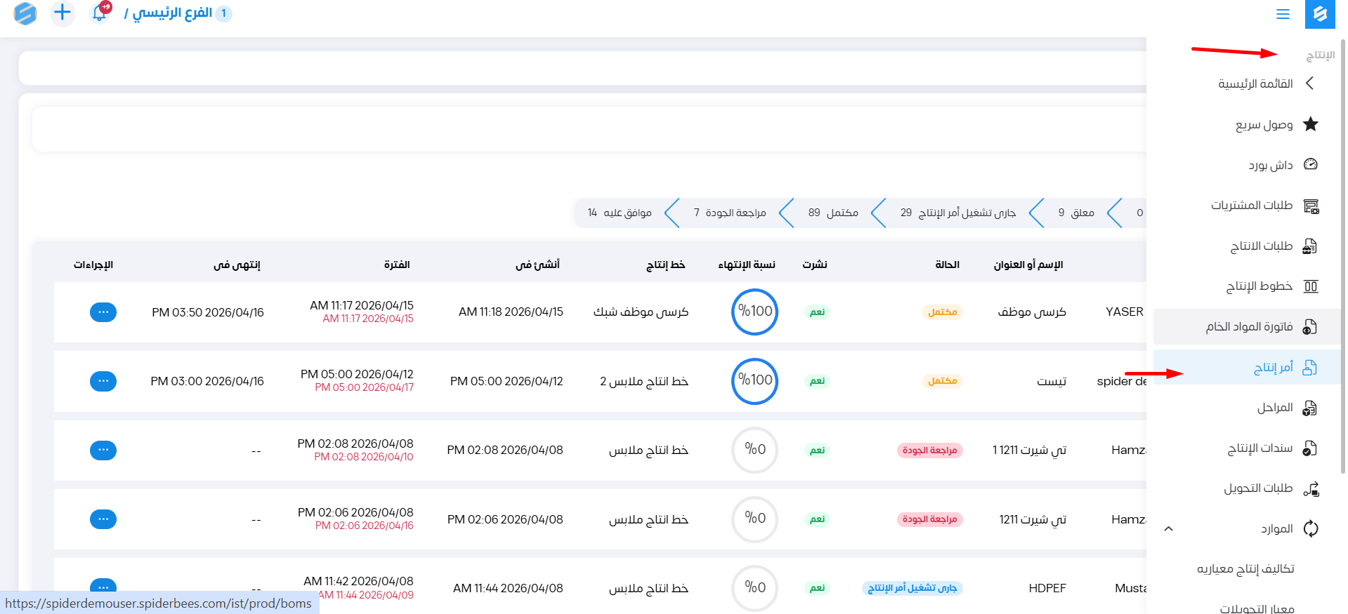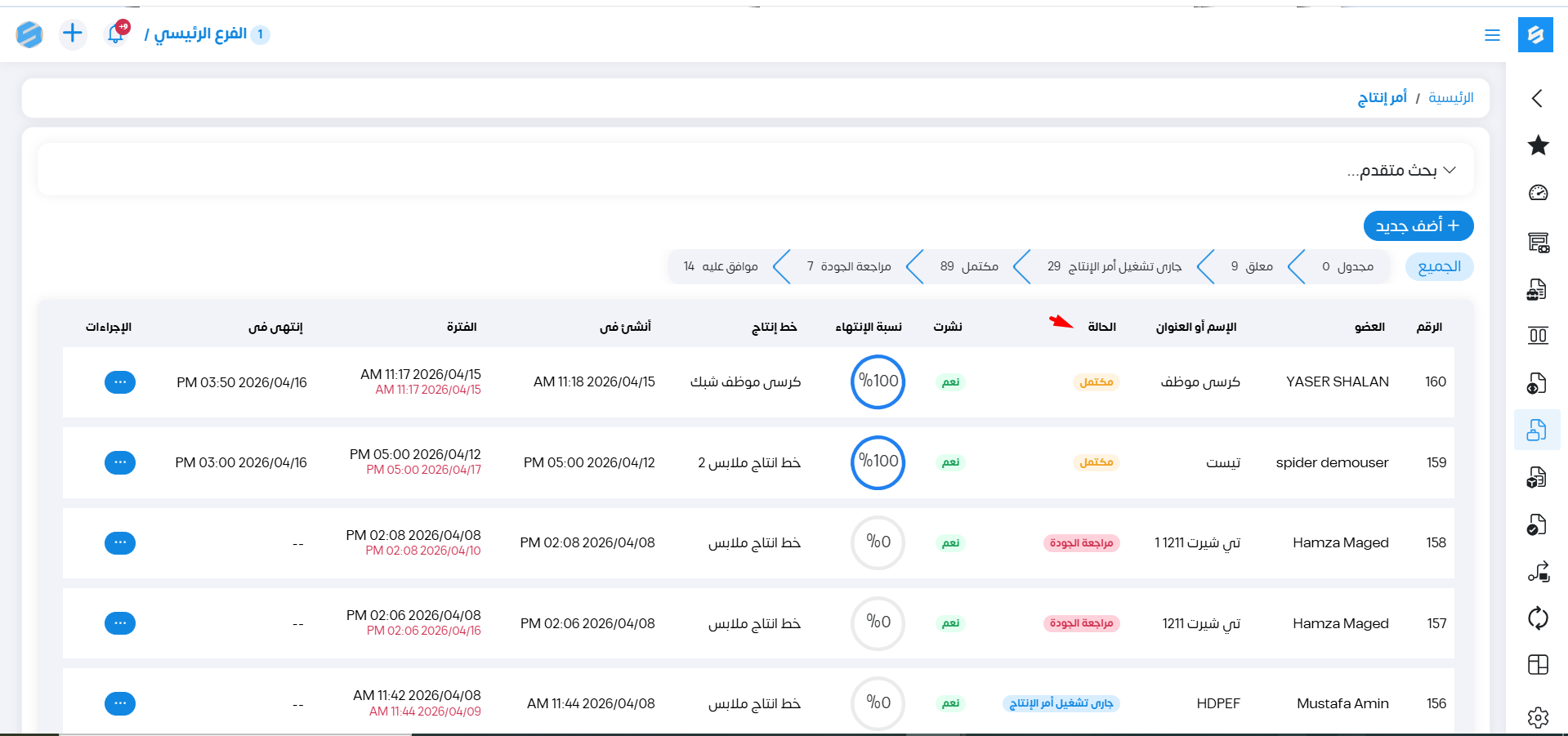 يظهر لنا جميع أوامر الإنتاج الجارية حاليا مع حالاتهم أو المكتملة بالفعل.