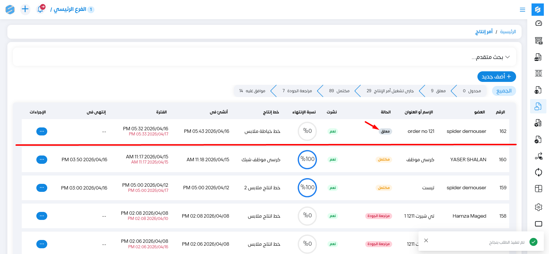 بعد الحفظ يظهر أمر الإنتاج وحالته معلق بالشكل التالي: