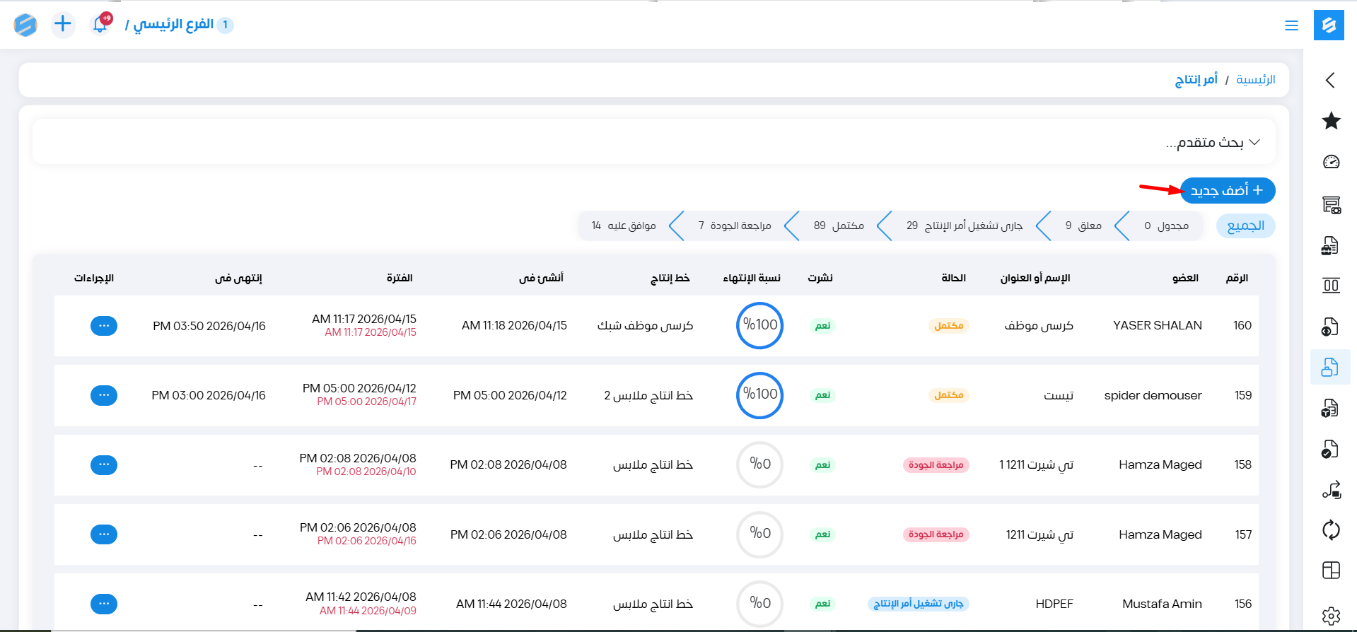 لإنشاء أمر إنتاج جديد نضغط على "أضف جديد"