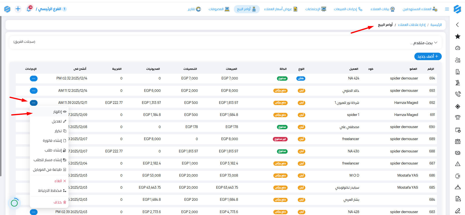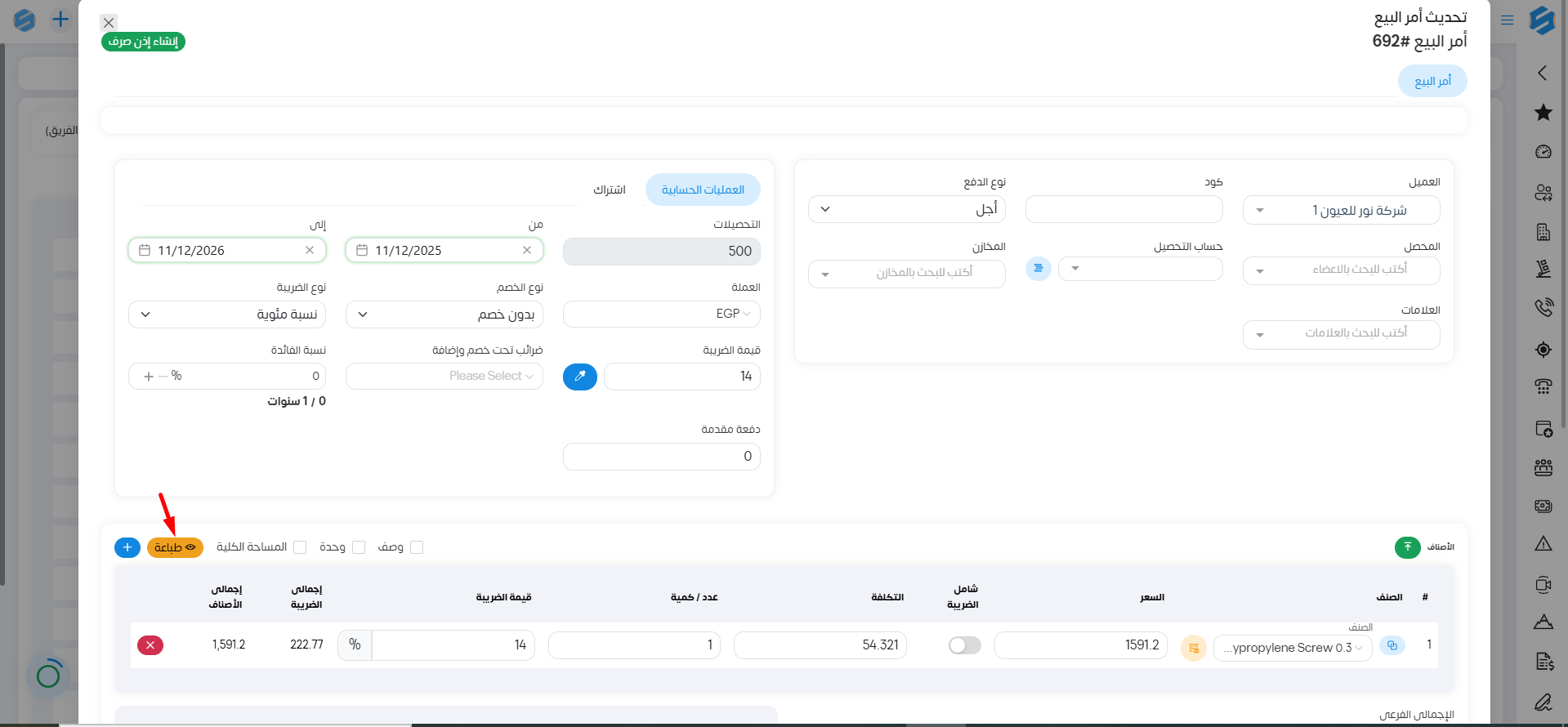من اوامر البيع نضغط على خانة الإجراءات لامر البيع المراد طباعته.