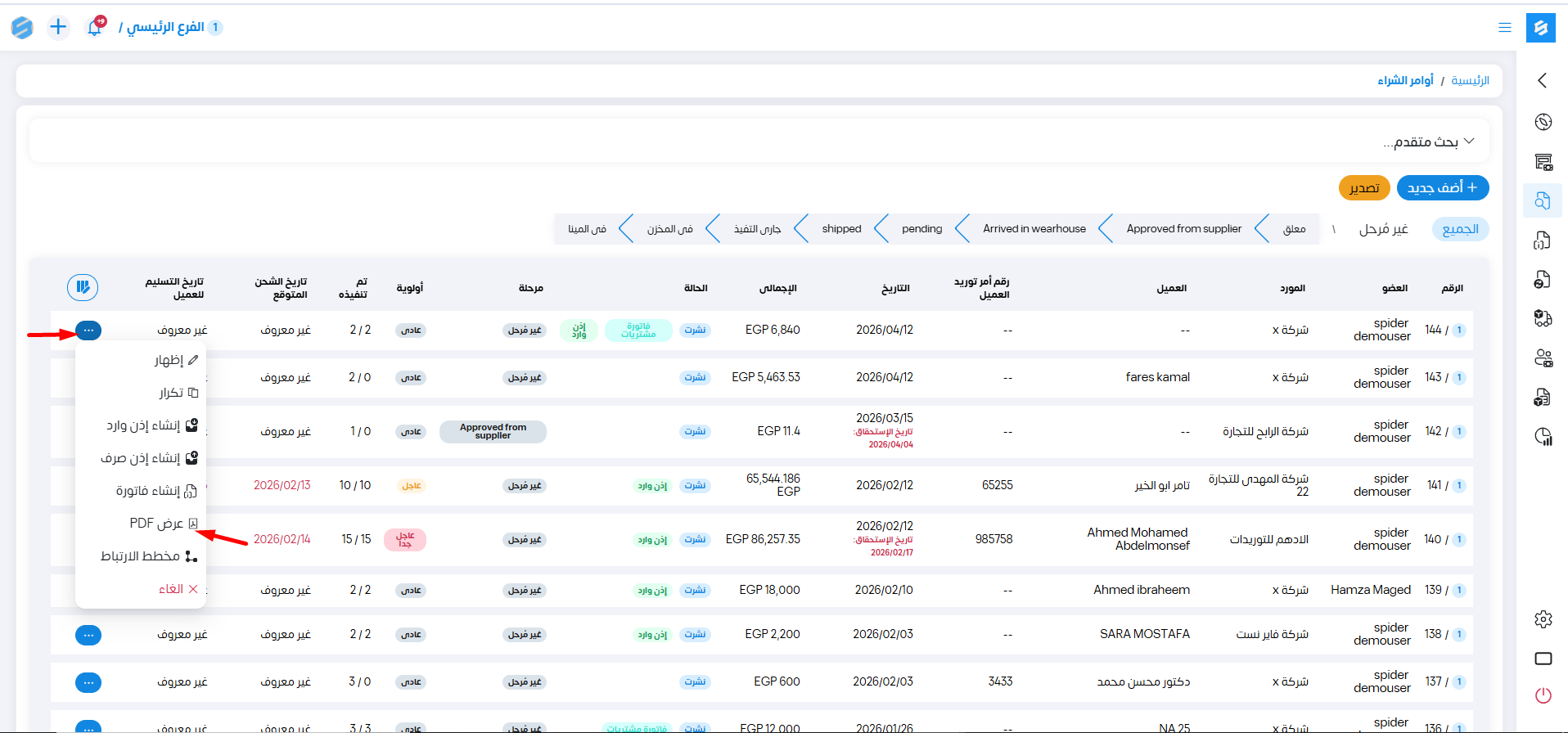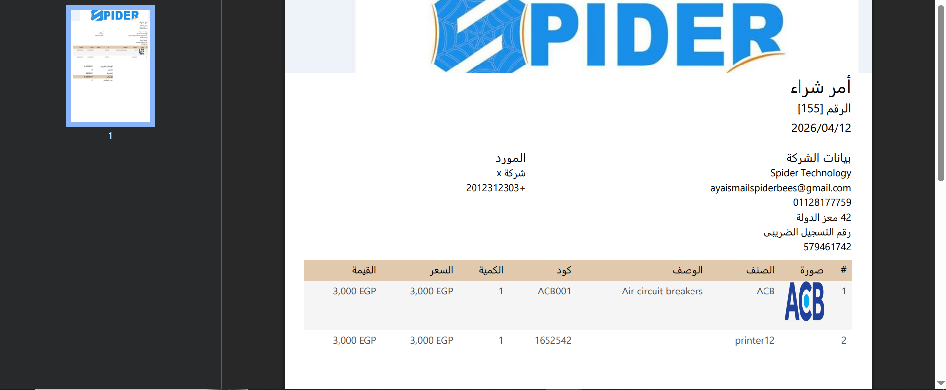 يمكننا عرض أمر الشراء بصيغة PDF بالشكل التالي ليتم تحميلها وارسالها :