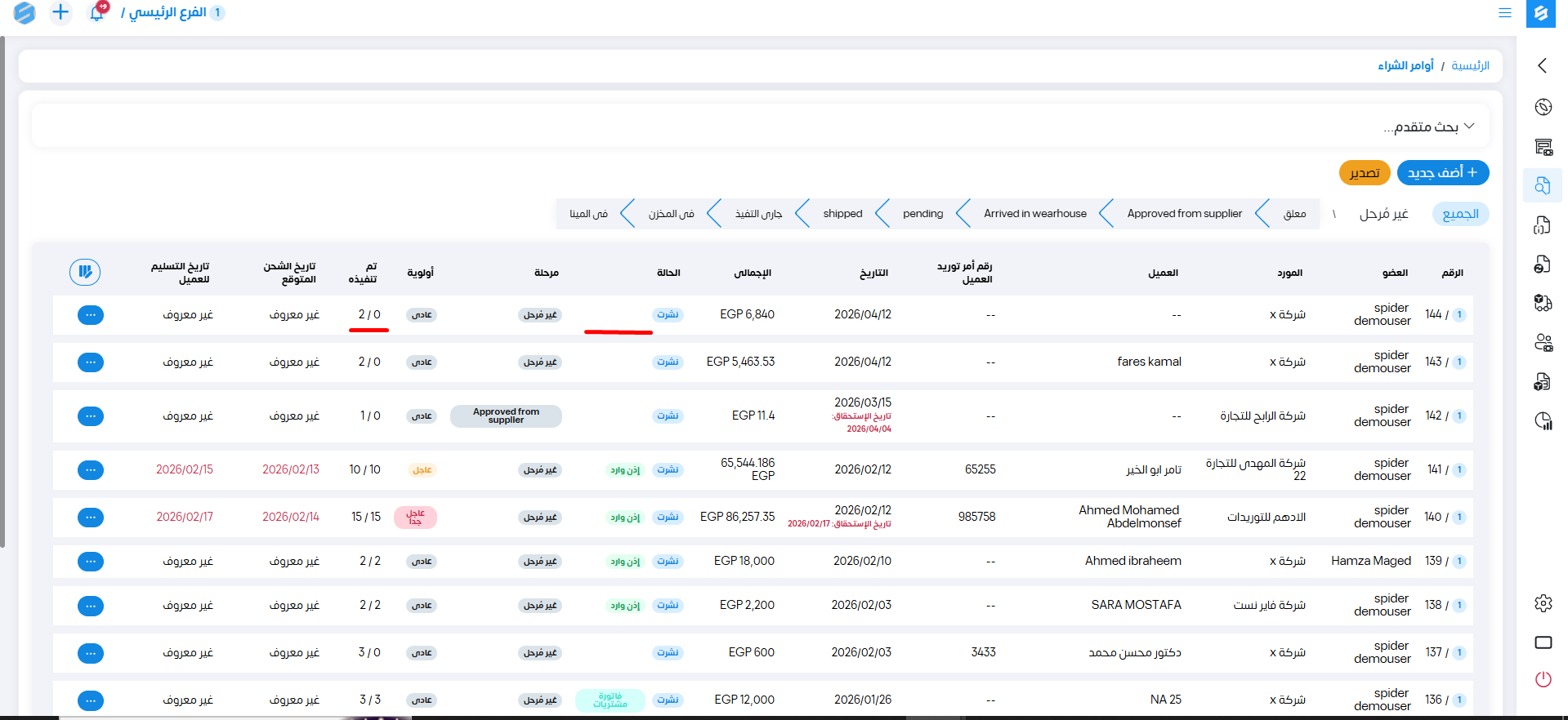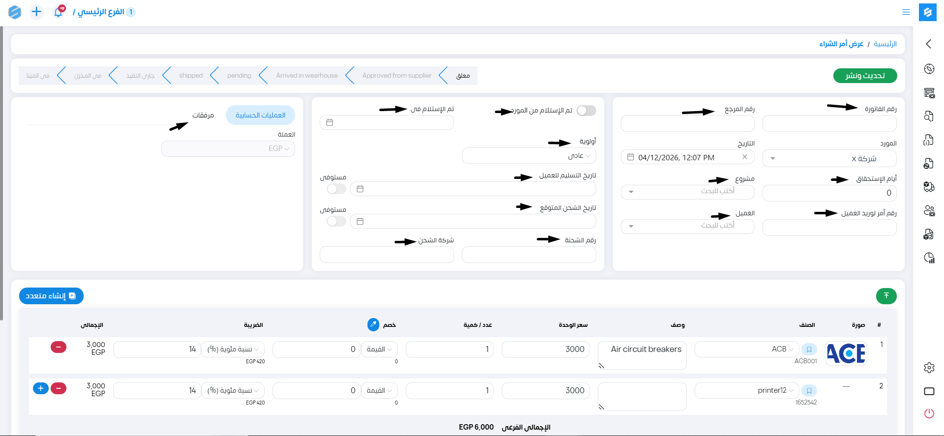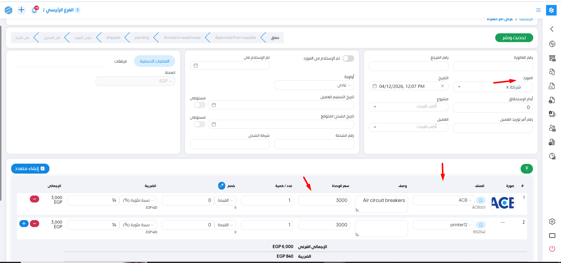 ويمكننا تعديل البيانات الإجبارية مثل المورد أو الاصناف