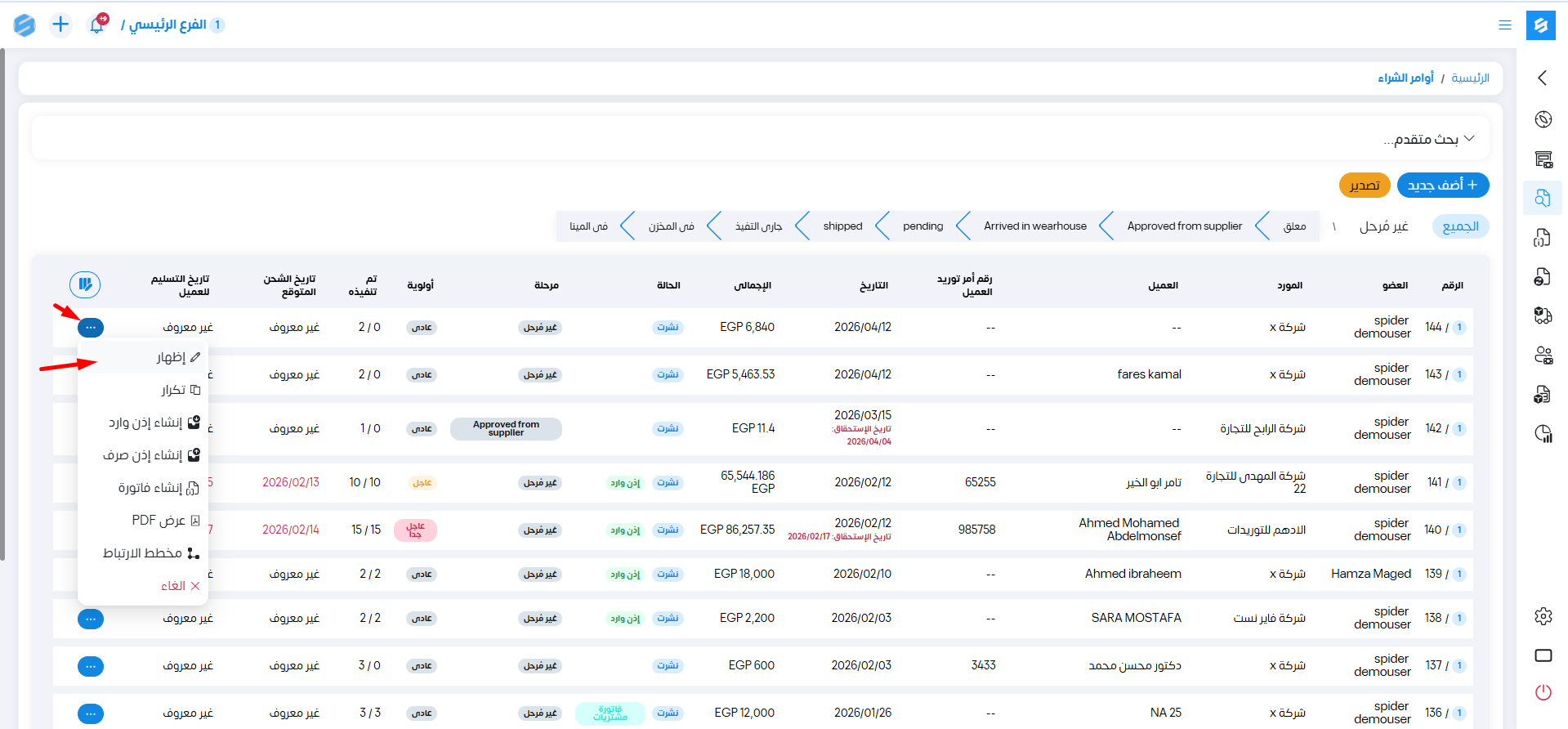 يمكننا تعديل أمر الشراء من خلال الضغط على إجراءات ثم إظهار.