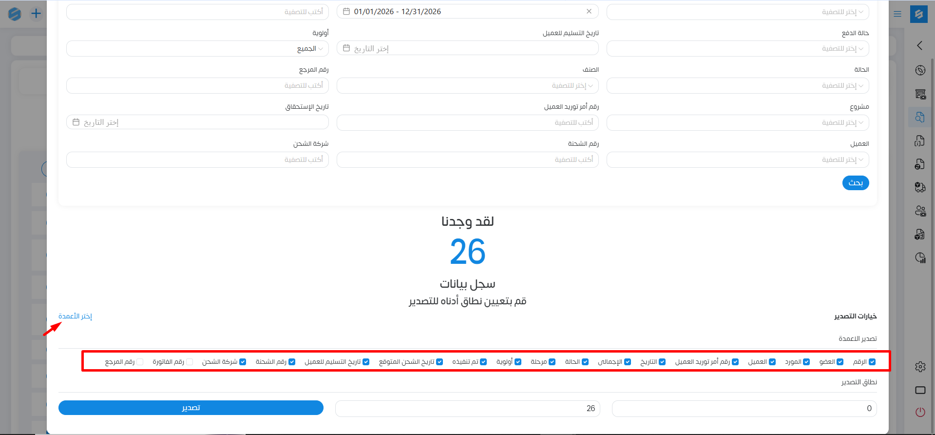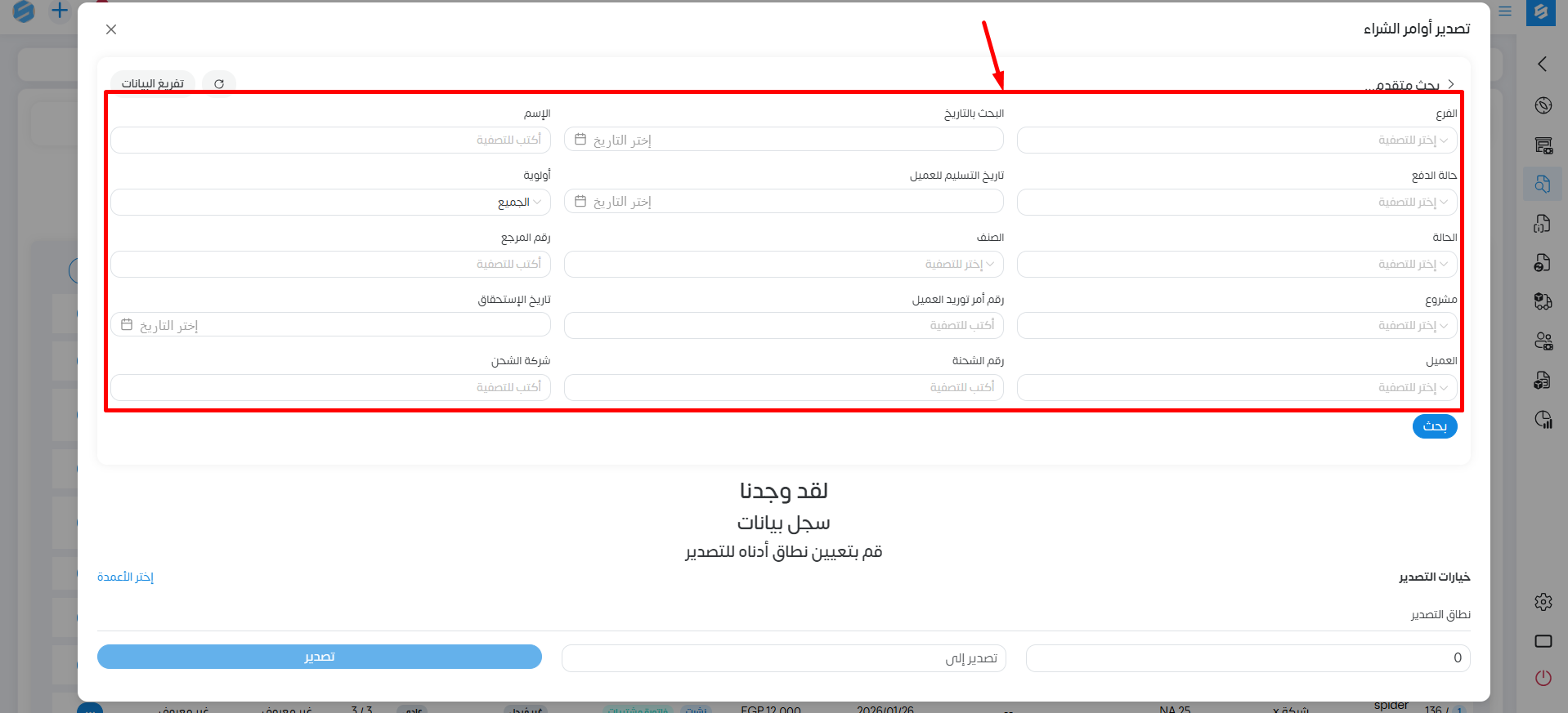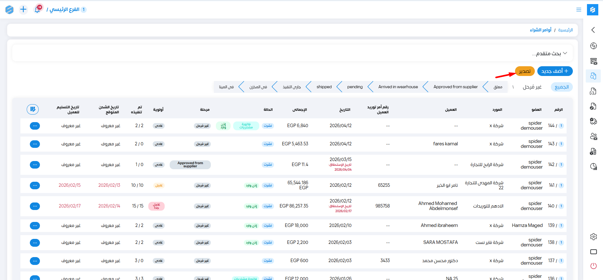 يمكننا تصدير أوامر الشراء من خلال الضغط على "تصدير"