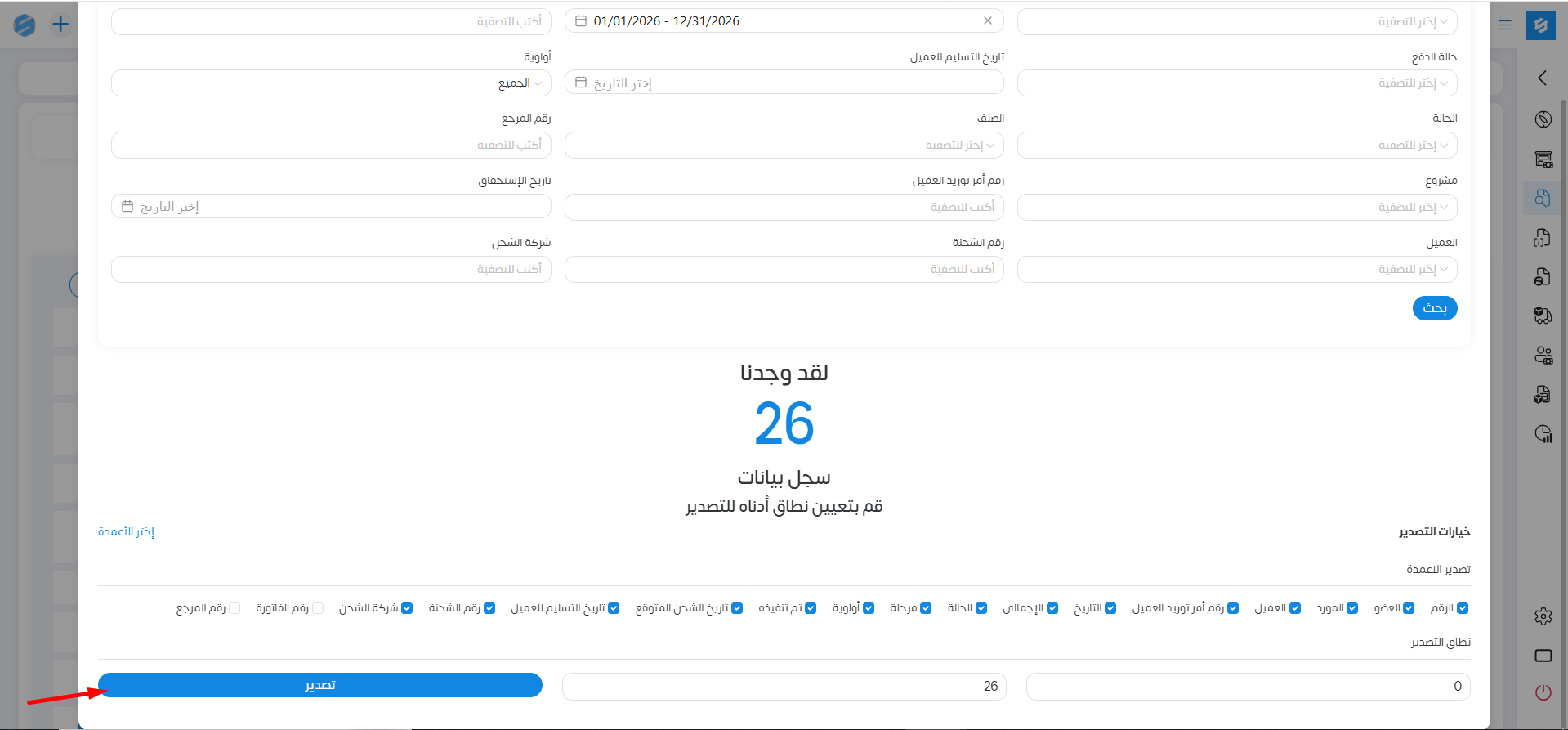 بعد الضغط على تصدير نقوم بالبحث عن البيانات المراد تصديرها ثم نضغط على بحث .