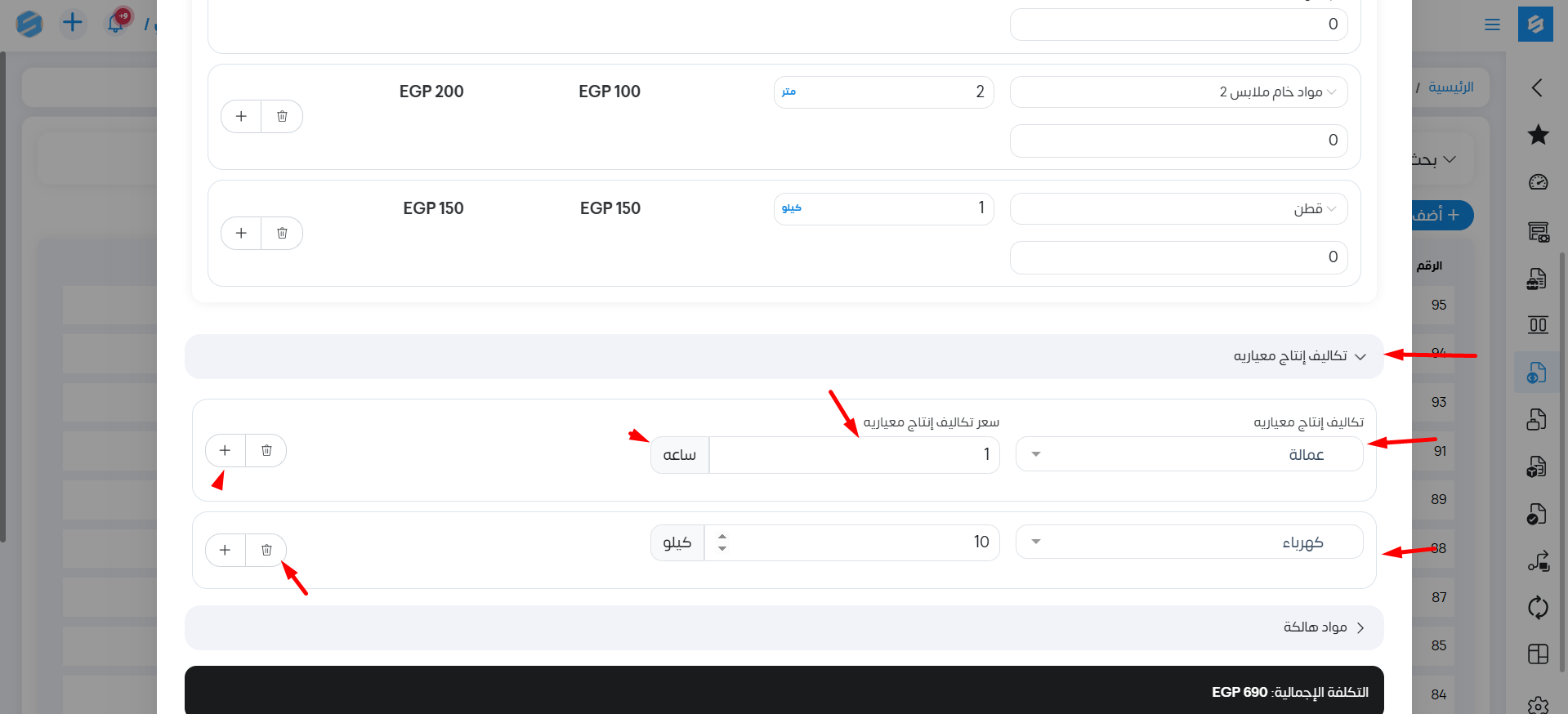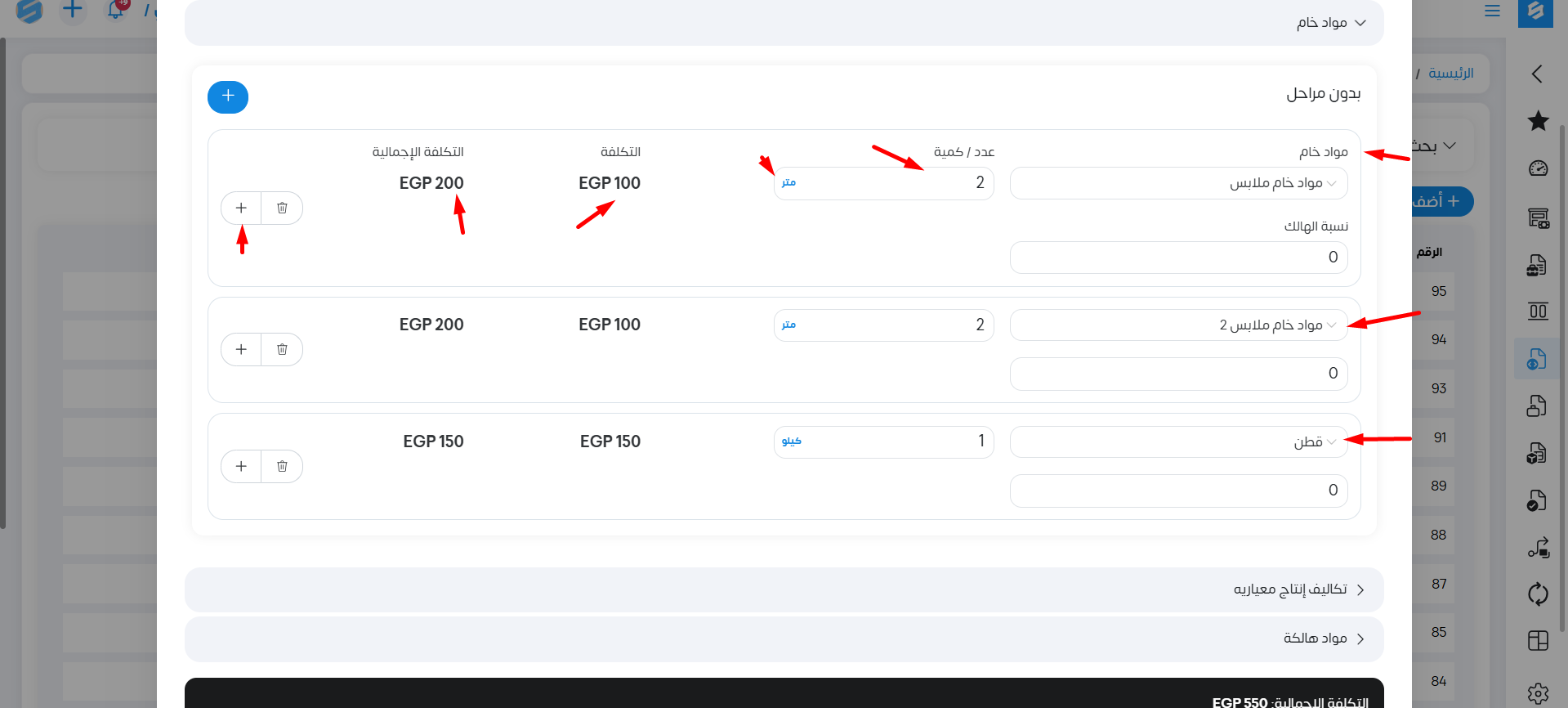 نبدأ بعد ذلك باضافة المواد الخام التي يتكون منها البضائع المجمعة بكمياتها: